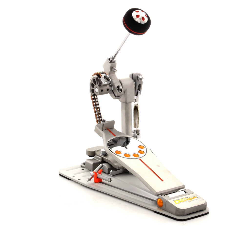 The new Demon Chain Pedal is driven by Pearl's ultra-lightweight Power Chain with low-friction rollers for speed and double chain construction for power and dependability. The orange anodized link plates identify the Demon Chain as a member of the Demon family of pedals: The Fastest, Smoothest, and Most Versatile Pedals available.