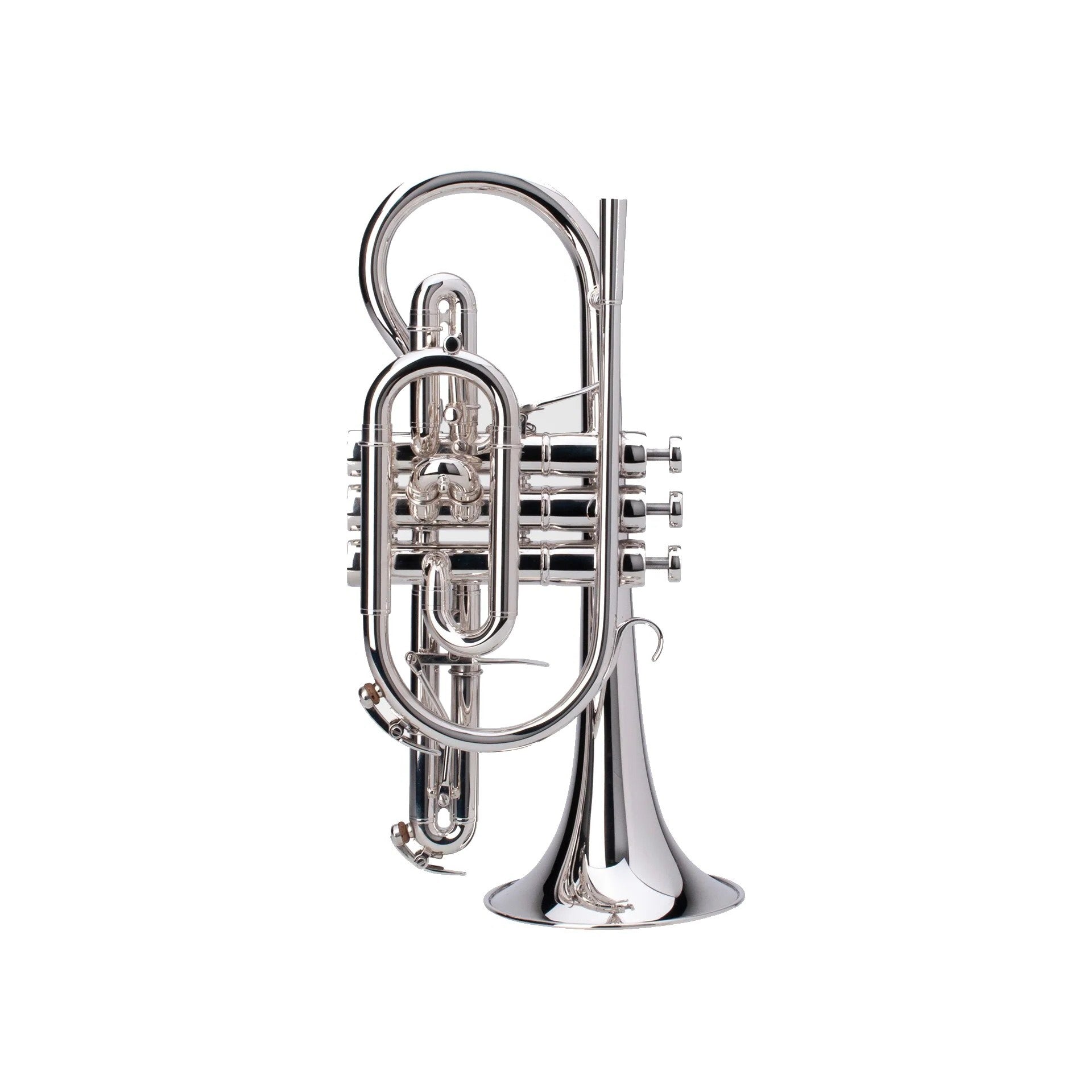 Of the two cornets that Adams builds, the CN1 is a true wind and fanfare band instrument adding warmth and softness to the trumpet section and expand the register's sound idiom. More and more composers are writing for trumpet/cornet. The instrument with short-action valves and shepherd's crook has a very direct articulation and responds easily in all registers. The CN1 cornet has an easy and responsive articulation. The typical "big, round" sound, blends smoothly into any orchestral environment. The instrument has a large bore (12 mm), short stroke valves and a medium heavy valve cluster and buttons, offering a superb sound quality. The inhouse, one-piece hand-hammered yellow brass bell produces a beautiful warm sound with great projection, and the silver plated finish adds a touch of brilliance to the sound.