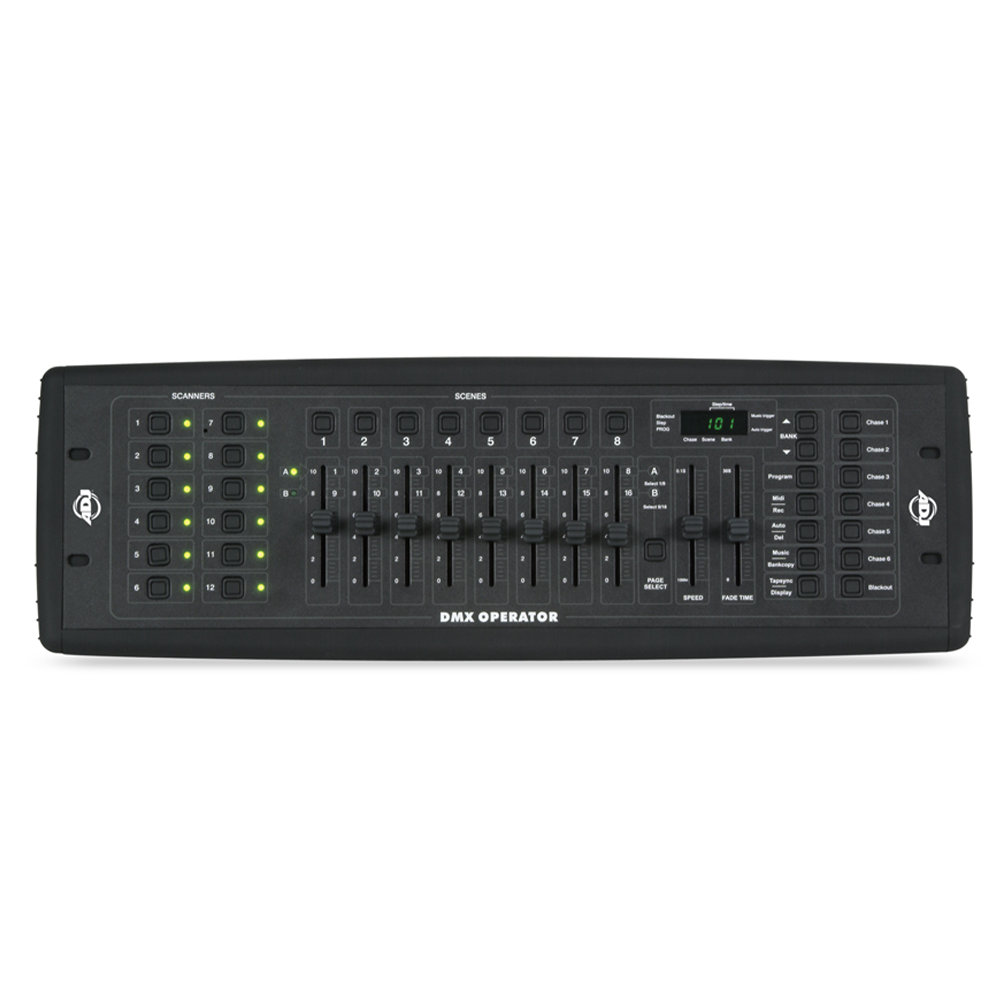 American DJ DMX Operator controls up to 192 DMX channels. Its is MIDI controllable and has a built-in microphone. Also it records up to 6 programmable chases with fade times and different speeds.