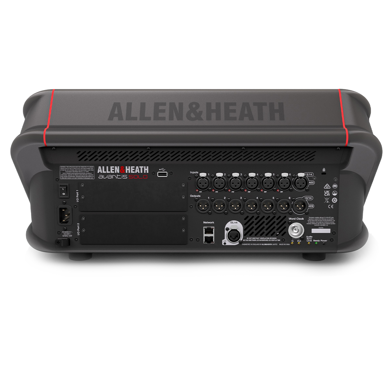Two additional I/O Ports allow Avantis Solo to benefit from the full range of current dLive option cards, including Dante (64x64 and 128x128), Waves, gigaACE, MADI and more, expanding the scope for system integration, digital splits, recording and connectivity the Allen & Heath DT range of Dante enabled expanders. For local I/O, Avantis is well equipped with 6 XLR analogue inputs, 6 XLR analogue outputs, plus AES (1x Stereo In, 1x Stereo Out).