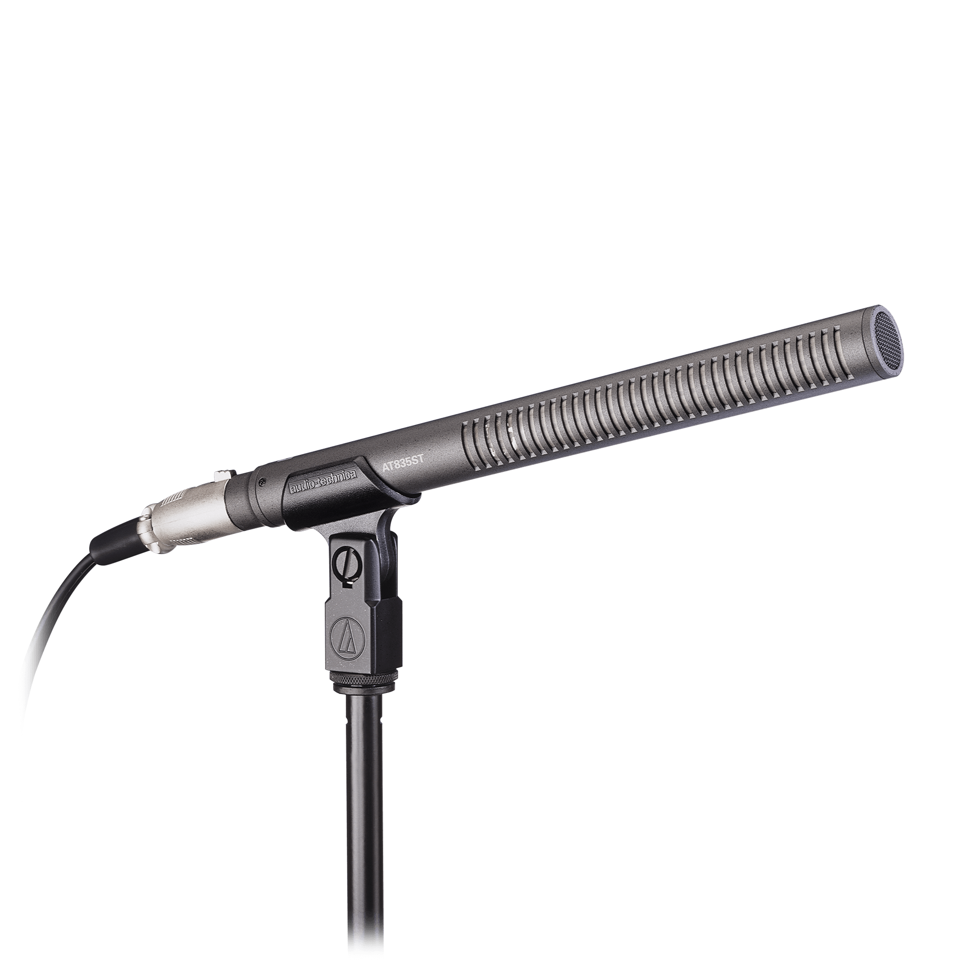 The AT835ST has been updated. Click here for more information on the newest model. At 9.29" (236.0 mm) in length, the AT835ST provides broadcasters, videographers and sound recordists professional quality stereo audio in a microphone that resembles a monaural shotgun mic. That means the AT835ST is easy to use with standard camera mounts, shockmounts and windscreens. Engineered for long-distance pickup in broadcasting and film/TV production, this compact M-S stereo shotgun features internal matrixing innovations that allow for stereo audio with or without an external matrix. It also features switchable low-frequency roll-off and independent line-cardioid and figure-of-eight condenser elements.