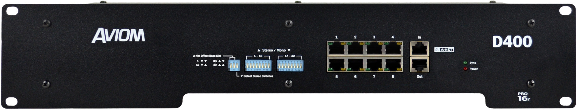 The D400 A-Net Distributors provide the link between the personal mixing system's inputs and the Personal Mixers, providing power and a copy of the digital audio stream to your Aviom Personal Mixers, utilizing standard Cat-5e cables. The standard D400 has an A-Net input, perfect for using with analog input modules or digital console cards from Aviom or our third party partners.