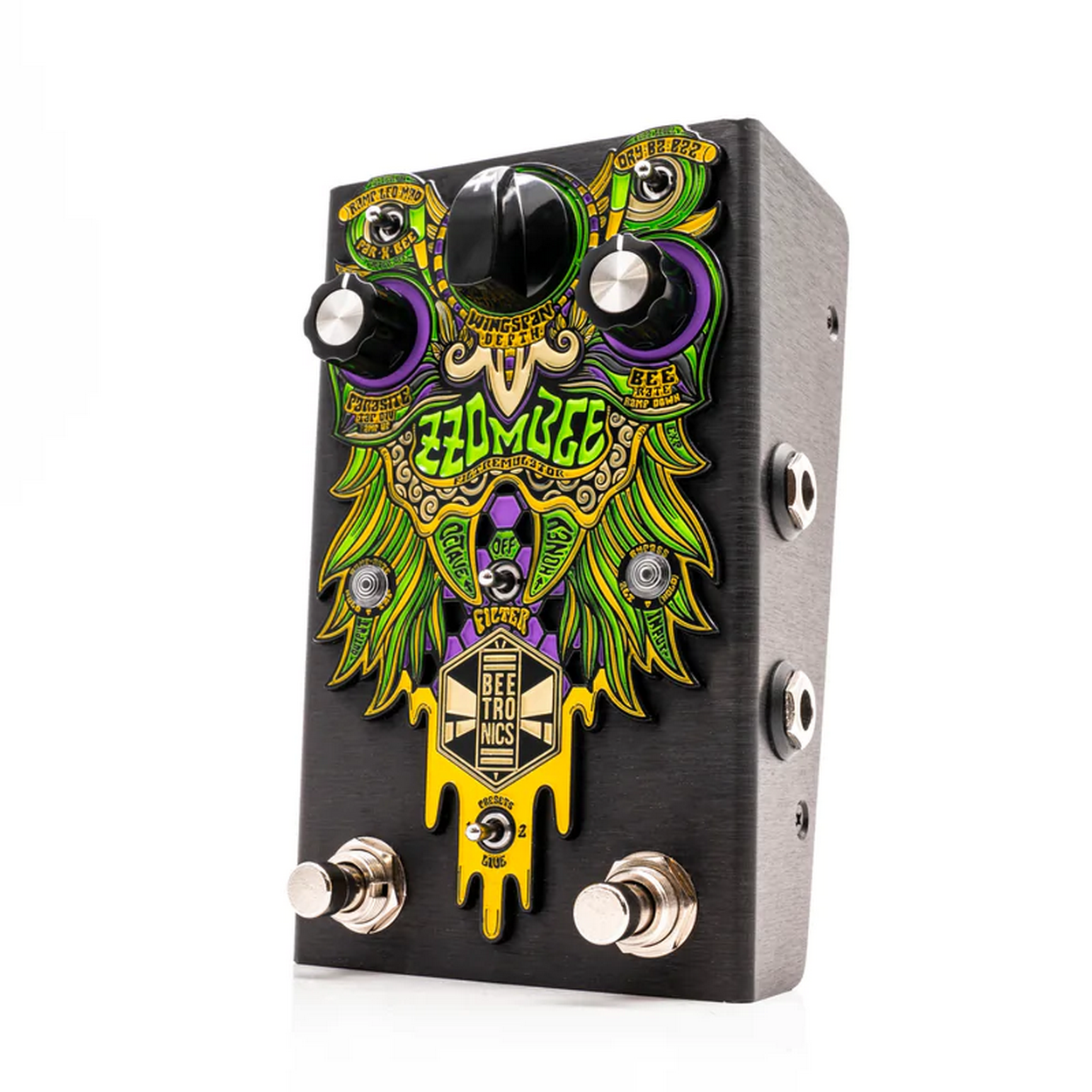 The zzombee “filtremulator” is a one of a kind analog multi effect that delivers filter, wah, lfo, randomized filter, tremolo, swells, overdrive, fuzz, low-octave and the never beefore heard honey patented cross tremolo, a very unique kind of tremolo that pulses between the fundamental and a low octave. Its unbeeliavable analog tones are enhanced by an innovative way of ramping and controlling modulation movements that uses a momentary footswitch in the most musical ways. These controls make the pedal an extension of your instrument, beecoming an essential tool to expand your creativity.