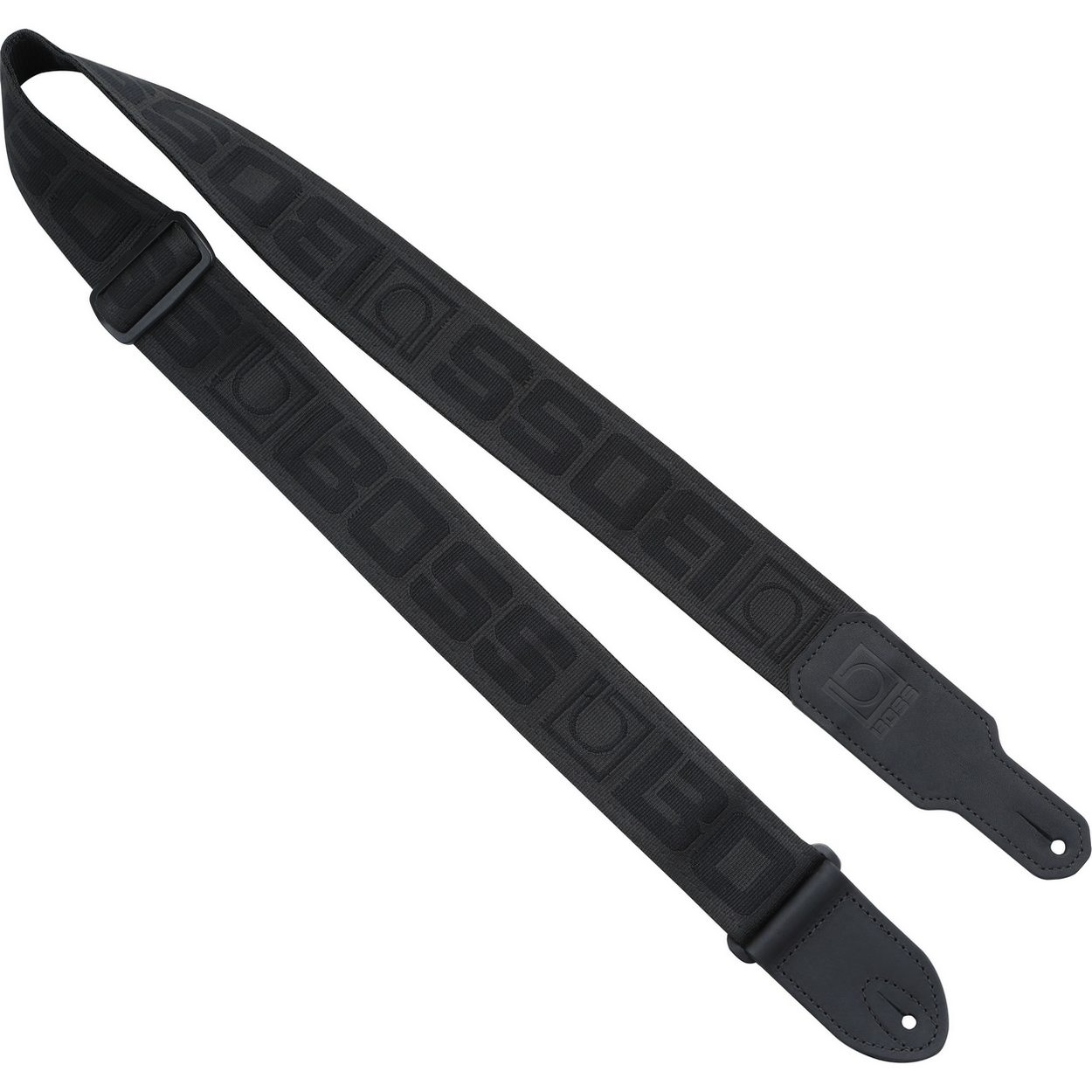 This is a Black strap with black BOSS logo. Show off your favorite gear brand with these quality USA-made instrument straps. Featuring the iconic BOSS logo in a repeating pattern, the two-inch wide nylon material is both comfortable and durable. American baseball glove leather is sandwiched at each end, providing a secure hold and lasting toughness for years of use. Also available in black with white logo (BSM-20-BW) and white with black logo (BSM-20-WB).