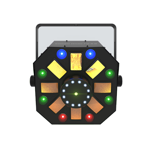 - 4-in-1 LED light that combines an RGBAW rotating derby, RGB+UV wash, red/green laser, and a ring of white SMD strobes