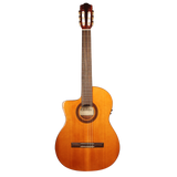 Based off of Cordoba's top-selling C5, the C5-CE adds a soft cutaway to provide easy access to the upper register, as well as Fishman Presys II preamp that amplifies your signal for stage and studio. Perfect as a first nylon-string guitar and ready for gigging, this lightweight guitar is built with a solid Canadian cedar top and mahogany back and sides to produce a warm, well-rounded tone with beautiful sustain both acoustically and amplified. The C5-CE's carved headstock, hand-inlaid wood rosette, Indian rosewood binding, Savarez strings, and glossy PU finish result in a guitar that truly stands out from all other entry-level options. A lightweight adjustable truss rod is built into the neck for stability.