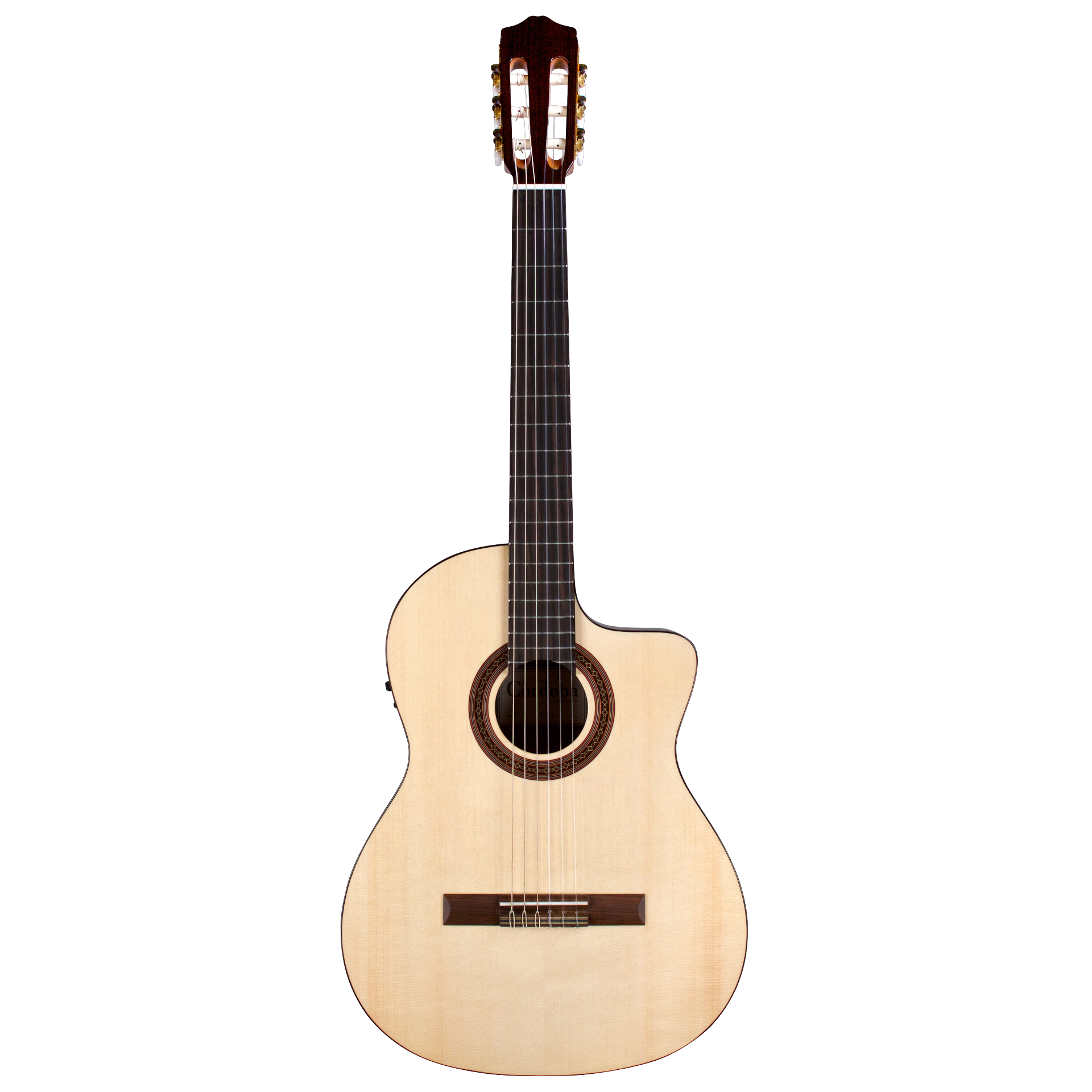Based on Córdoba's top-selling C5-CE, the C5-CE Spruce adds a new option to a fan favorite. A soft cutaway provides easy access to the upper register, and a Fishman Presys II preamp amplifies your signal for stage and studio. Perfect as a first nylon-string guitar and ready for gigging, this lightweight model is built with a solid Engelmann spruce top and mahogany back and sides to produce a clear, powerful tone with beautiful sustain. Handmade in the traditional Spanish style, the C5's carved headstock, hand-inlaid wood rosette, Indian rosewood binding, Savarez strings, and glossy PU finish result in a guitar that truly stands out from all other entry-level options. A lightweight adjustable truss rod is built into the neck for stability.