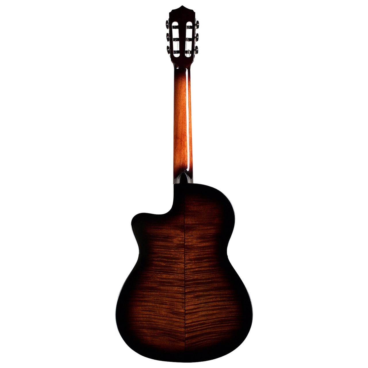 Córdoba's entry into the fusion line! The perfect choice to transition from a steel string to a nylon guitar, the Córdoba Fusion 5 features a solid spruce top, mahogany back and sides, a full body with cutaway for extended playing range, side dot fret position markers, and a pearl decal rosette and arches. The fusion neck with a 16-inch radius fretboard and smaller, 1.875-inch (48 mm) nut width provides a playing experience very close to that of a steel string guitar. This familiarity offers an easy transition for steel string players and players with smaller hands to the world of nylon string guitar. Added side dot markers also depart from traditional nylon string guitar construction, providing players reference for their position on the fretboard. Equipped with the Fishman Sonitone Pickup System, the Fusion 5 is ready to plug in and play. The Gloss Sonata Burst finish comes with elegant flamed mahogany back and sides.