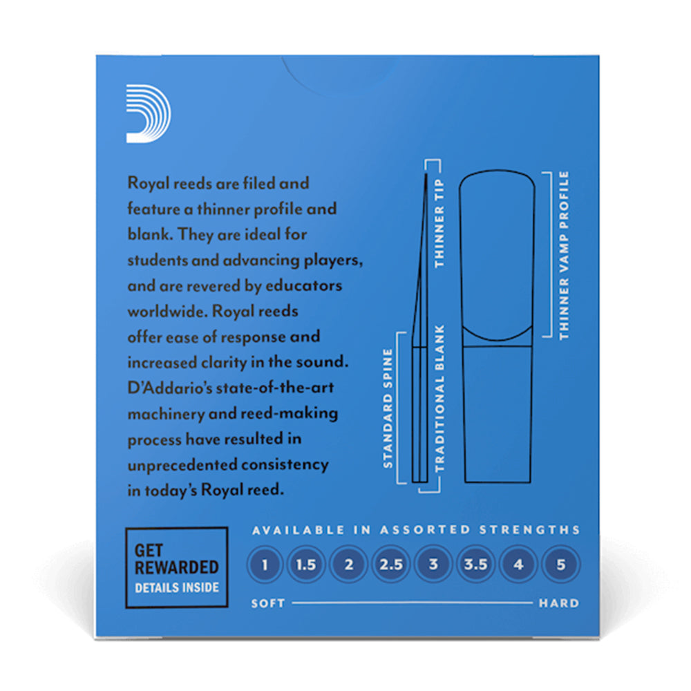 Featuring a filed cut for additional tonal clarity, Royal by D'Addario Alto Saxophone reeds are ideal for both beginning and advancing players. These reeds have a traditional blank and profile to give you an ease of response when playing.