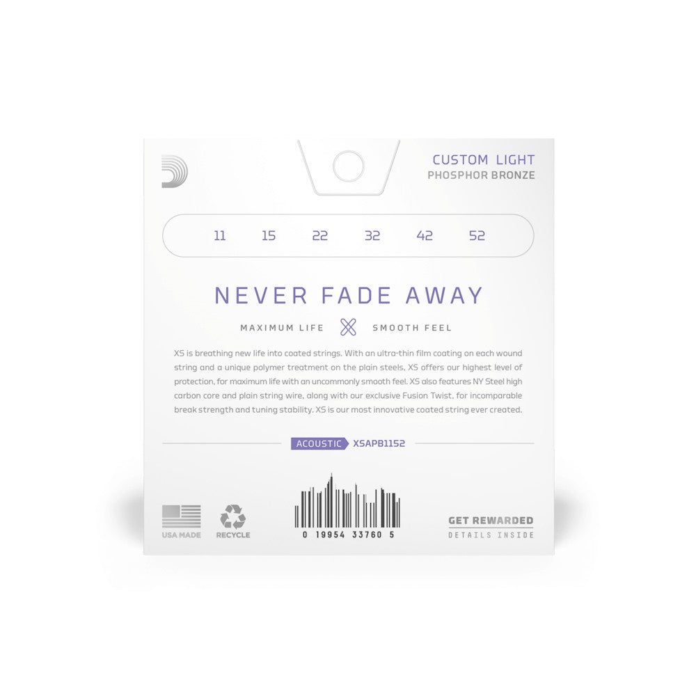 Born from D'Addario's greatest breakthrough in string innovation, XS Phosphor Bronze strings have the longest life of any D’Addario acoustic guitar string. The XS coating gives these warm, balanced phosphor bronze strings maximum life, with an uncommonly smooth feel. Made with a NY Steel core, phosphor bronze wrap wire, and Fusion Twist technology, XS coated acoustic guitar strings have incomparable break strength and tuning stability, in addition to their dramatically increased lifespan. 11-52 Custom Light strings have slightly more volume and projection than Extra Light, while still being easy to play.