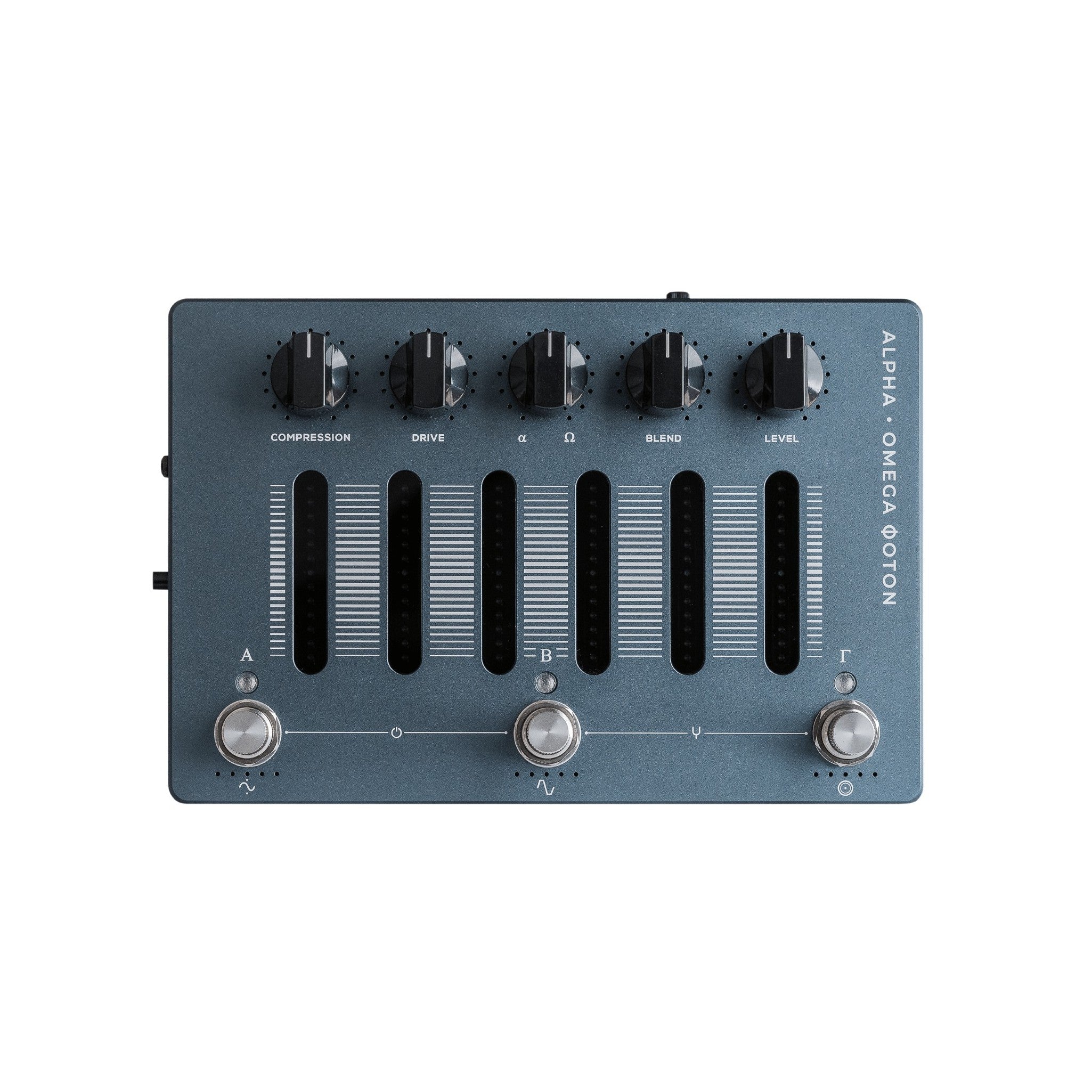 The Compression potentiometer is the one-knob solution for compression on the Alpha-Omega Photon. This controls the amount of input gain to the compressor and intelligently applies the correct amount of makeup gain so that your signal is always driven at the appropriate level, no matter how much compression is applied.