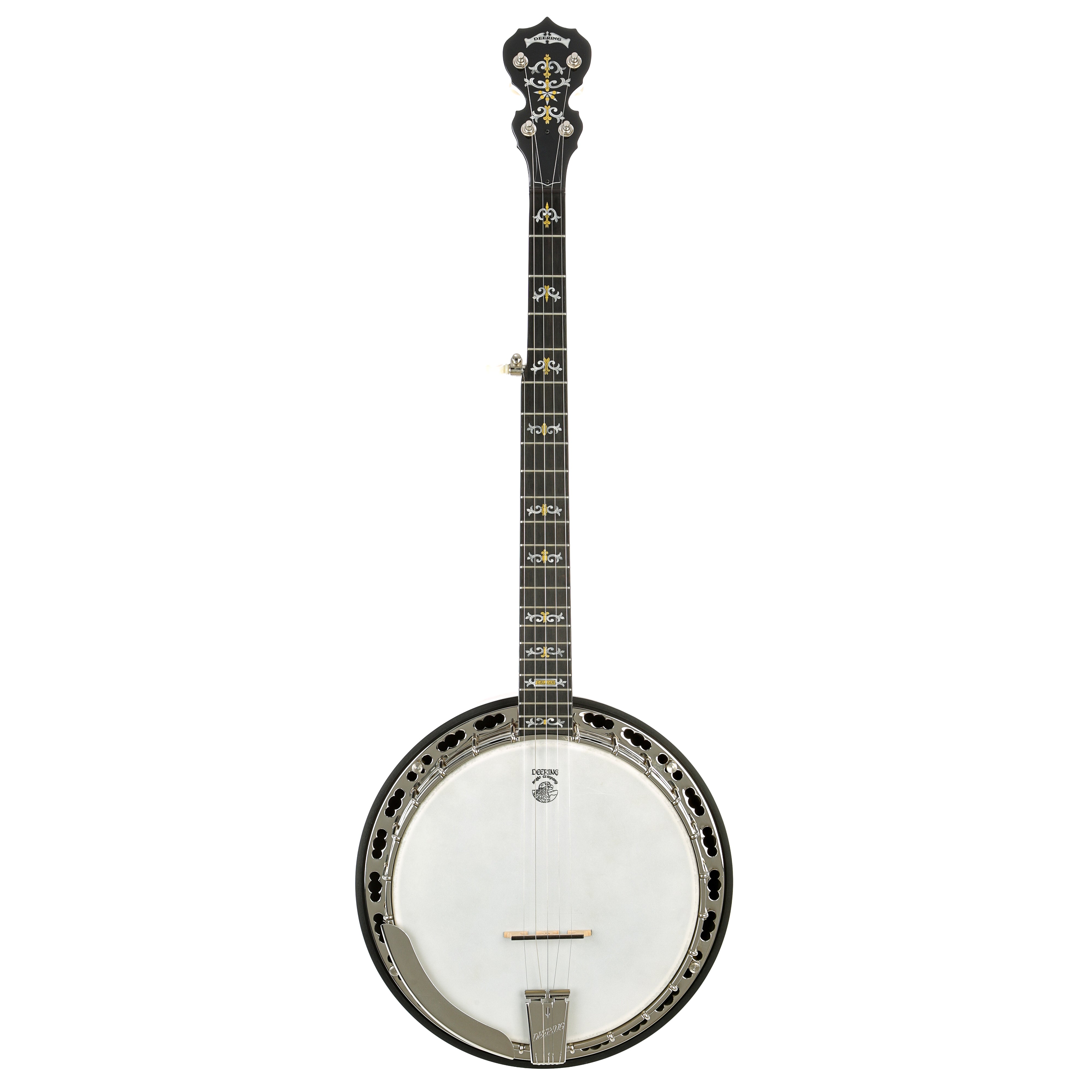 "The inspiration for the inlay artwork comes from the early Boston banjo masters. And if you look at the peghead of the Deluxe, it has some of the same elements as the Sierra, but it is much more expanded and it comes alive with the turn of the century Boston masters element - and that was just the design that flowed out onto the page. It's a lot of fun to have that kind of artwork on a banjo that people can afford. The first professional banjo we made was the Deluxe so it always has a very dear spot to us because it was the first professional banjo we made way back in '79." - Greg Deering