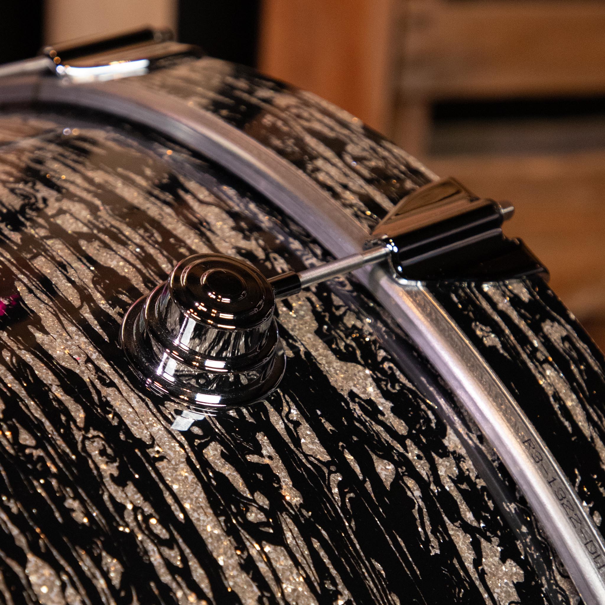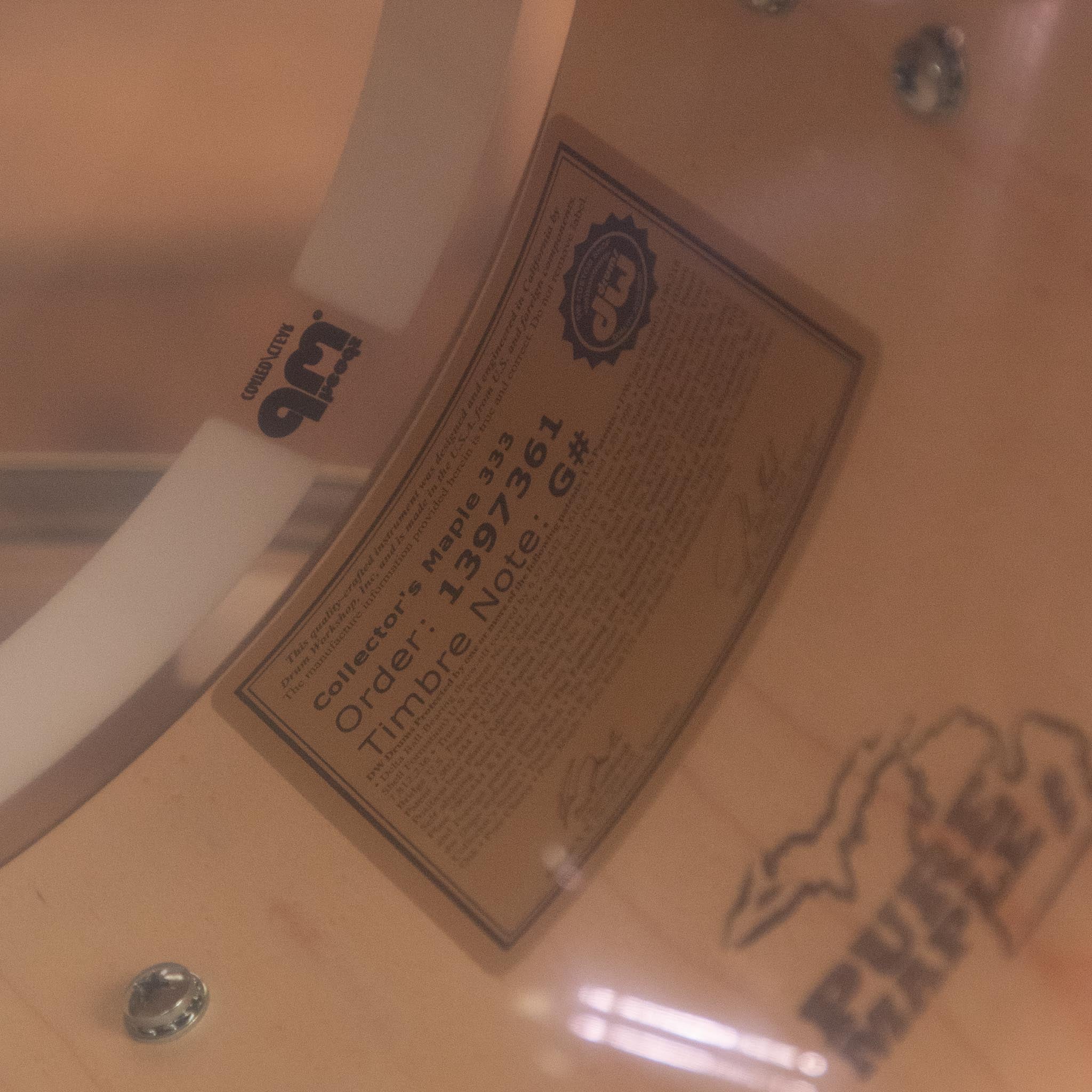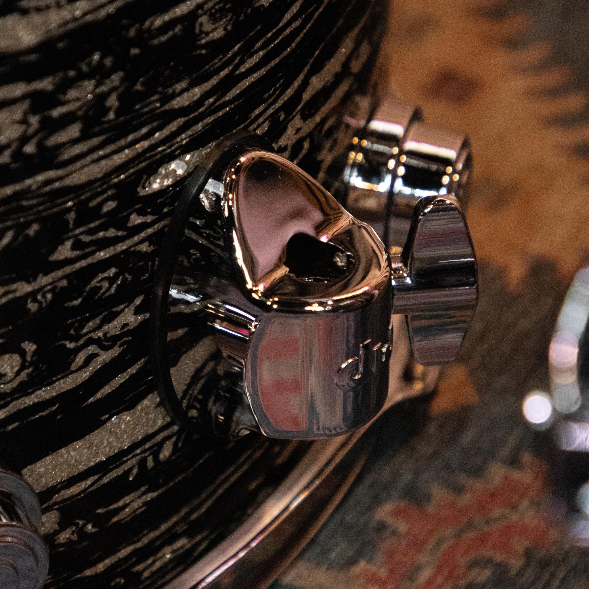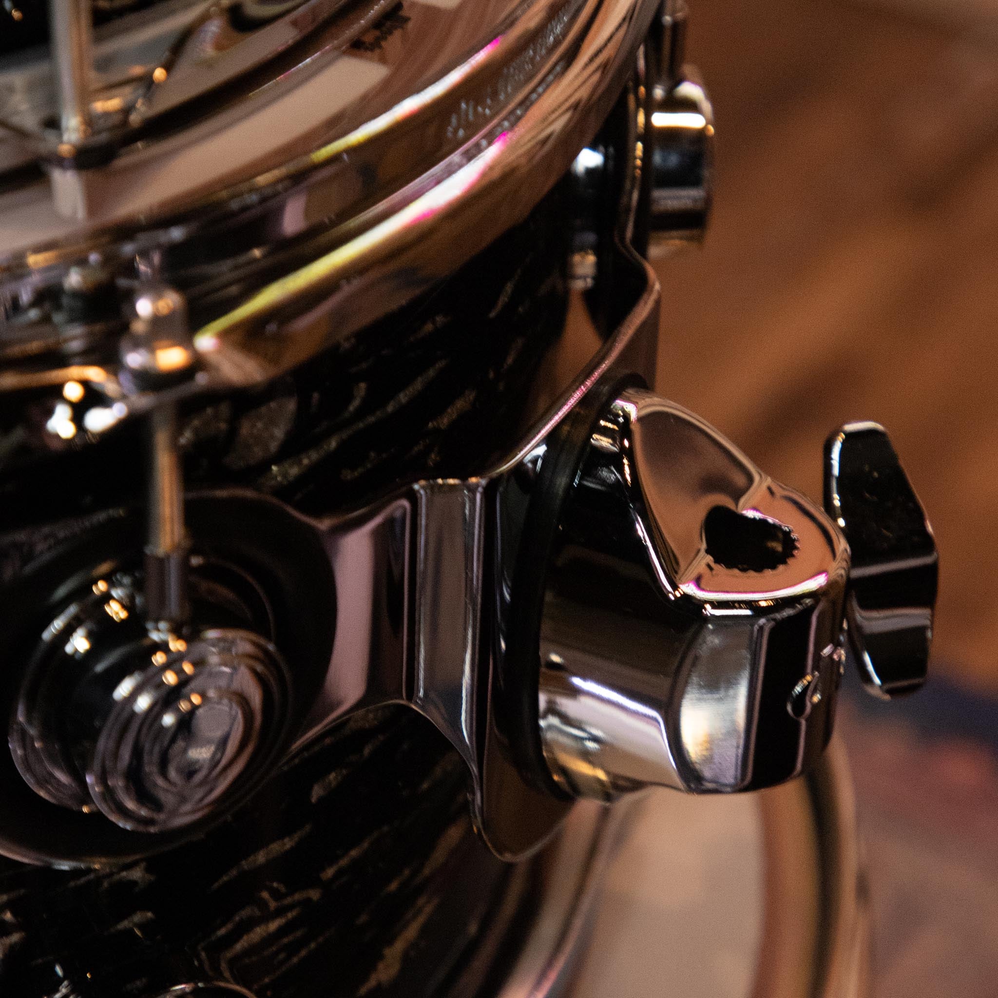 This Drum Workshop 4-piece is constructed of a 9-ply pure maple shell using their VLT technology. Alterations in grain direction greatly influence the sound. In a VLT shell, the outermost and innermost plies run vertically, rather than a traditionally horizontal configuration. The vertical grain places less tension on the shell, thus allowing it to vibrate more freely, resulting in a lower fundamental pitch. This 9-ply VLT evolution also has no reinforcement hoops and produces a lower overall tone while still maintaining maximum resonance and attack.