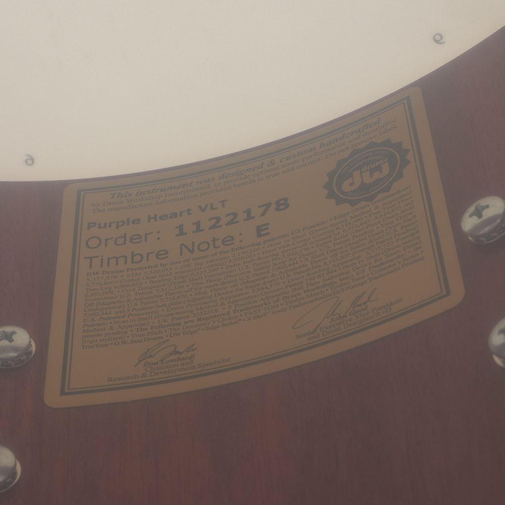 In experimenting with different exotic woods as alternate shell making materials, DW's Custom Shell Shop discovered that in addition to the different tonal qualities inherent in every unique type of wood, alterations in grain direction can also greatly influence sound. In a VLT shell, the outermost and innermost plies run vertically, rathern than a traditionally horizontal configuration. The vertical grain places less tension on the shell, allowing it to vibrate more freely, resulting in a lowered fundamental pitch.