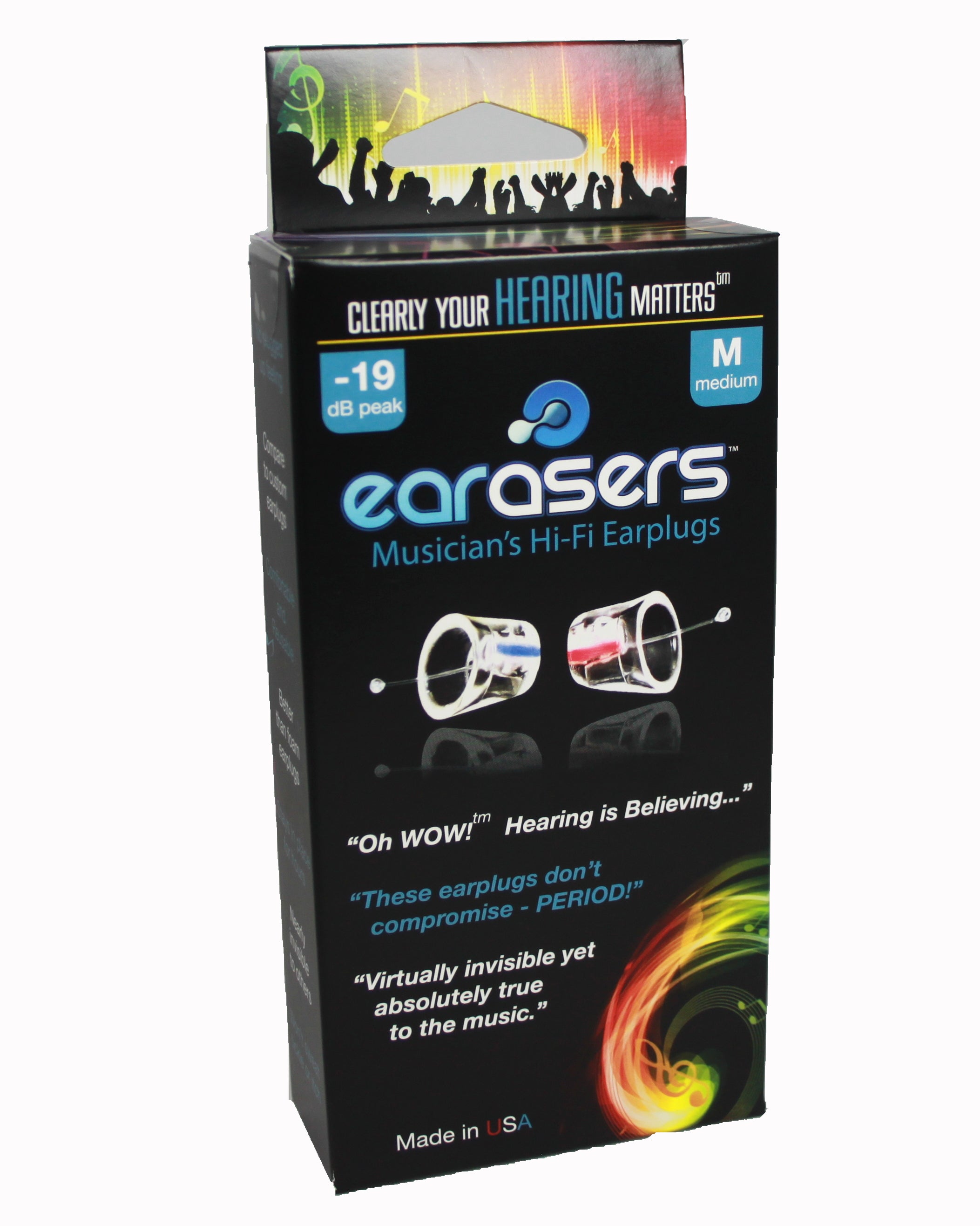 Whether you are a musician, attend concerts or are regularly exposed to music played at high levels, Earasers don't plug up your ears and muffle sound like more conventional earplugs. Manufactured by a 45+ year hearing aid company, and developed by their lead engineer - a musician for over 20 years - Earasers filter out loud noise while still allowing you to hear at a safe, comfortable level.