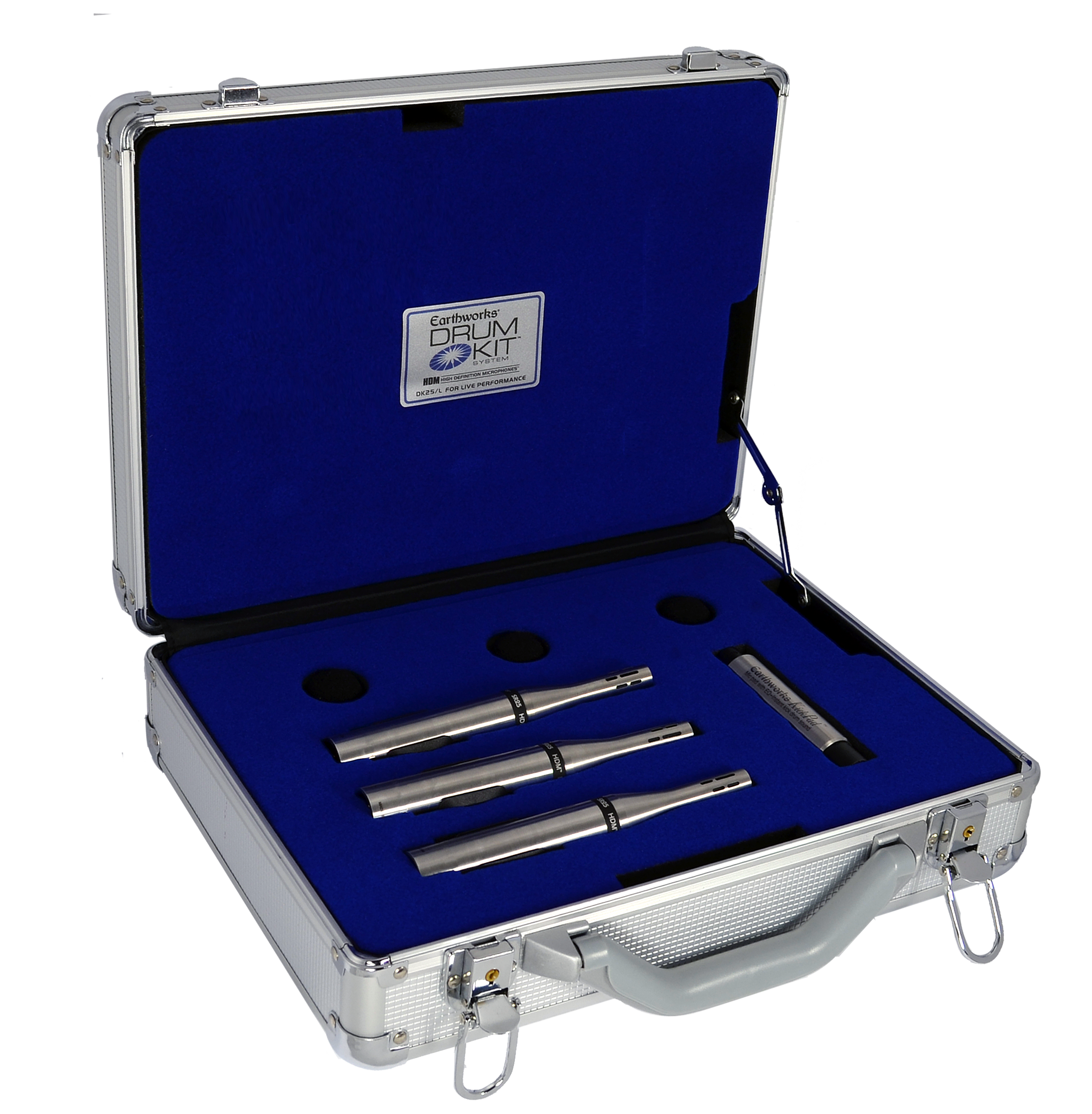The Earthworks DK25/L is for live performance and has three SR25s: two for overheads and one for kick drum, a KickPad™ and a windscreen. The patented cardioid pattern on the Earthworks SR25 provides a more uniform off-axis response and has less susceptibility to acoustic feedback. The Earthworks DK25/L is also ideal for use with multi-miked drums (four or more mics) in either live or studio applications. In such cases it is recommended that two SR25s are used for overheads.