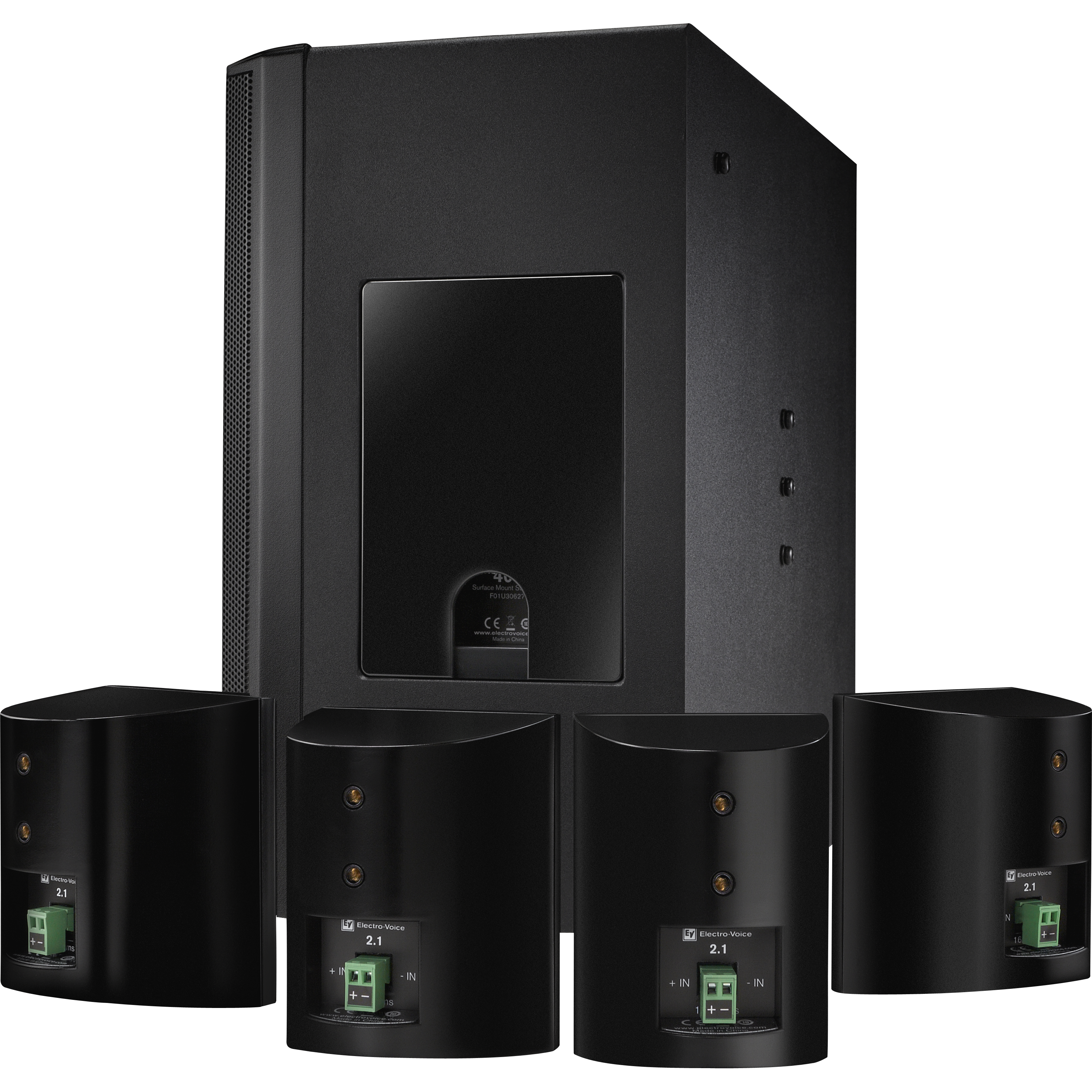 The subwoofer enclosure shall be constructed of MDF with a vinyl wrapped exterior. The satellite speakers shall be constructed of fire rated ABS. The subwoofer enclosure shall be 15.75 inch (400 mm) high, 15.75 inch (400 mm) wide, and 9.06 inch (230 mm) deep. The satellite loudspeakers shall be adjustable over a range of 160° horizontally and 60° vertically. The support bracket shall be low profile and fully detachable from the enclosure. The surface mount loudspeaker system shall be the EVID S44 or the EVID S44W models made by Electro-Voice.