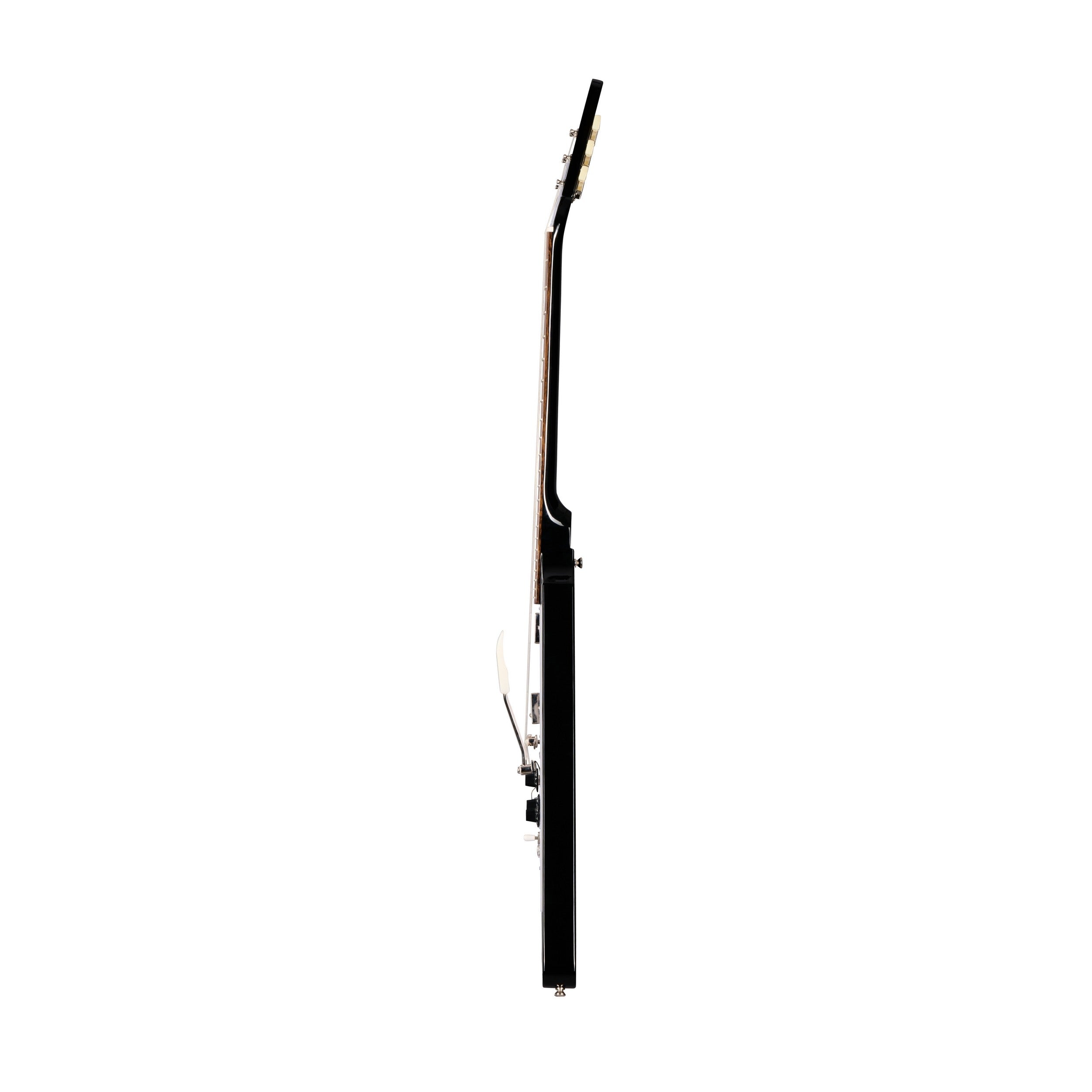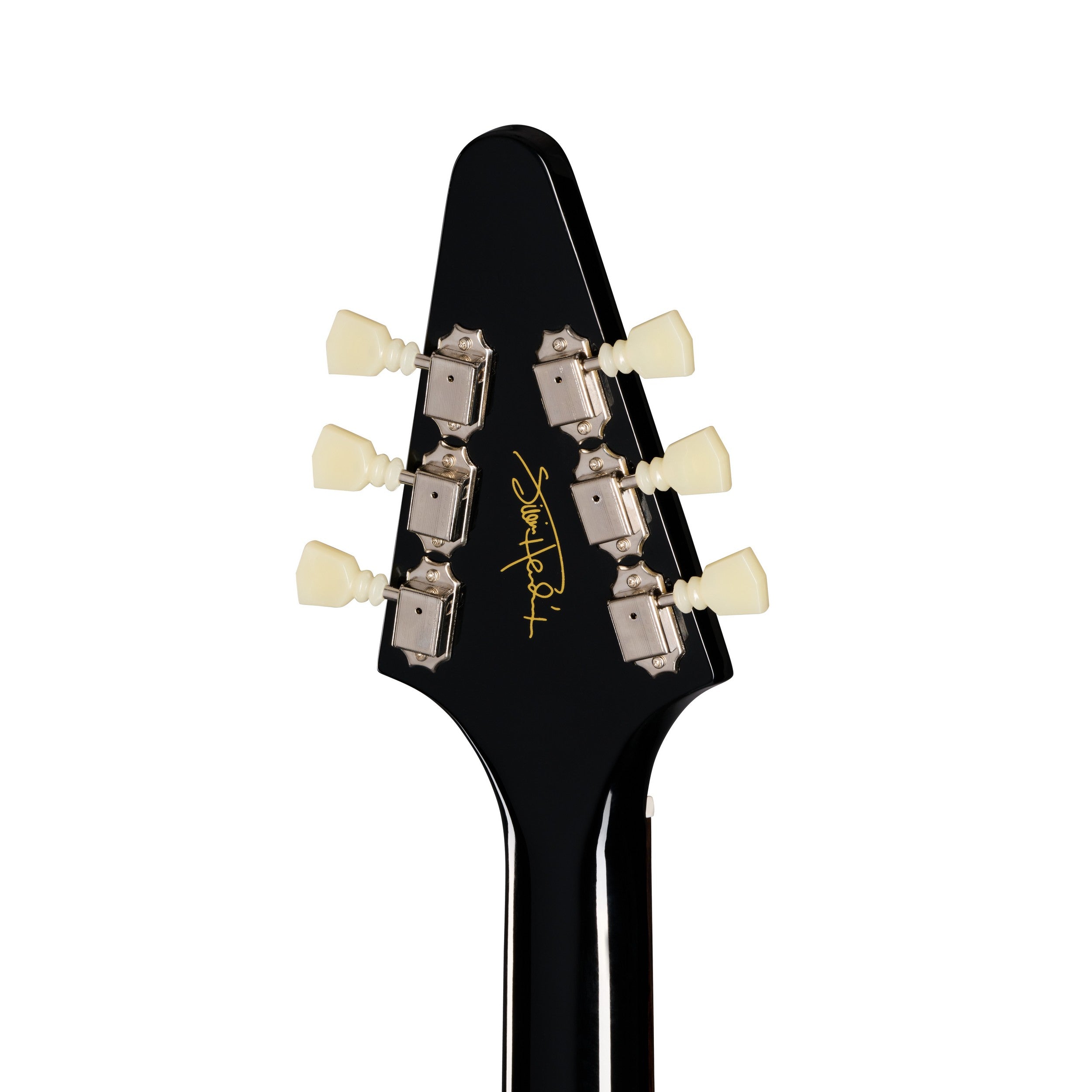 Jimi Hendrix™ is widely regarded as the most innovative guitarist of the rock era, a player who took the instrument to places no one else had ever gone before. Now, Epiphone, in partnership with Gibson Custom and the Hendrix family, is proud to introduce the Jimi Hendrix “Love Drops” Flying V™, an Inspired by Gibson Custom recreation of a guitar that Jimi played extensively from 1967-1969. Originally a Sunburst, Jimi Hendrix customized his Ebony-refinished Gibson™ Flying V with psychedelic graphics that he hand-painted, which are recreated here. The Jimi Hendrix “Love Drops” Flying V also features a mahogany body, a one-piece mahogany neck with a rounded C profile, a laurel fretboard, and 22 medium jumbo frets. An Inspired by Gibson Custom logo and reproduction of Jimi’s signature adorn the back of the 1967-style Flying V headstock. Epiphone Deluxe tuners anchor the strings at the headstock, while a short Maestro™ Vibrola™ anchors them at the other end. The electronics are first-rate, with a pair of Gibson Custombucker humbucker™ pickups wired to CTS® potentiometers, a Mallory™ tone capacitor, and a Switchcraft® 3-way pickup select switch and 1/4” output jack. An Epiphone hardshell case with Inspired by Gibson Custom and Authentic Hendrix™ logos is also included.