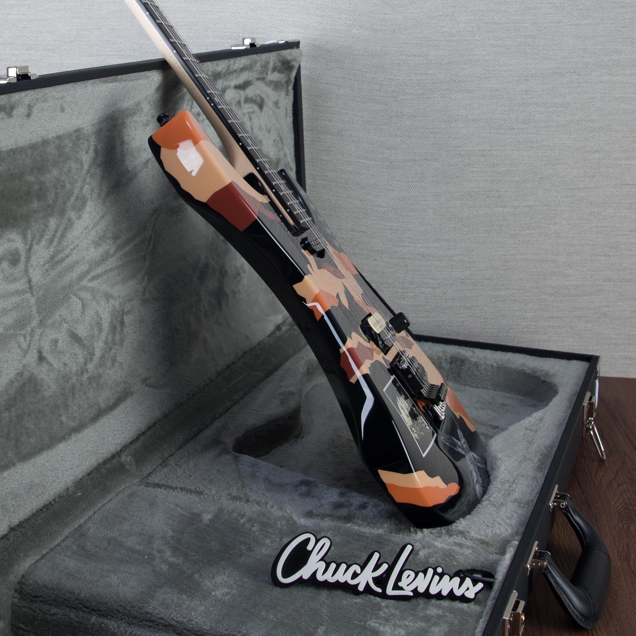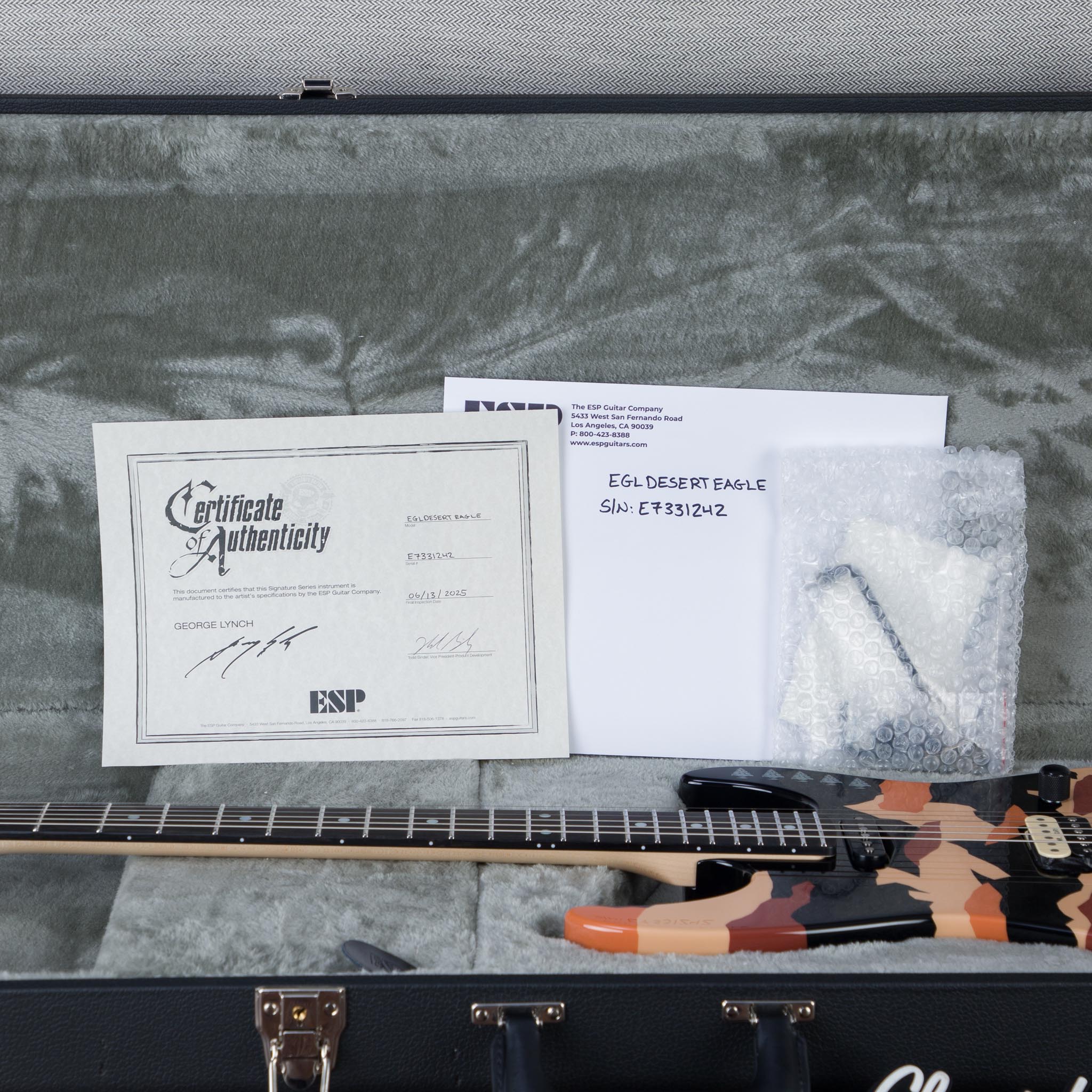 Handcrafted one at a time by the expert master luthiers at the ESP Custom Shop in Japan, the ESP GL Desert Eagle is the latest Signature Series guitar for the iconic musician George Lynch. As one of the world’s most respected and influential guitarists, George Lynch was one of the very first ESP Signature artists to join our roster back in the 1980s. This guitar, an evolution of George’s legendary Kamikaze guitar, is a striking design that has a graphic theme accented by double feathers and arrow heads. Like most of George’s personal custom shop models, the ESP GL Desert Eagle offers a maple body, which provides both a fast attack and a clear, bright sustain. It also includes a bolt-on maple neck at 25.5” scale, profiled to George’s original U shape, with an ebony fingerboard, dot position markers, and 22 extra-jumbo stainless steel frets. Components on the ESP GL Desert Eagle include a Floyd Rose Original double-locking tremolo which has been upgraded with a fat brass tremolo block and stainless steel screws, as well as ESP strap locks. This guitar also features a truly outstanding set of pickups. The bridge pickup is an Arcane Mr. Scary humbucker with zebra covers, while the neck pickup is an Arcane GL Desert Eagle Single Coil, with pickup selection handled with a push-pull on the single volume knob. Includes deluxe ESP hardshell case and certificate of authenticity.