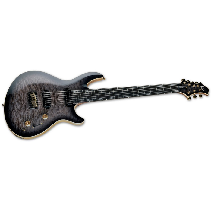 Respected worldwide for his innovative, emotive playing style, Javier Reyes pushes the boundaries of how the electric guitar can be approached with progressive rock band Animals As Leaders and in his soulful solo work with Mestis. Introduced in 2021, the LTD JR-7 is a 7-string version of Javier's well-known 27" baritone scale ESP signature guitar. It offers neck-thru-body construction for stability and sustain, a swamp ash body, quilted maple top, and a 5-piece walnut/maple/padauk neck with Macassar ebony fingerboard. It features a custom inlay pattern in white pearloid, 24 extra-jumbo frets, and glow-in-the-dark side markers. Top-tier components on the JR-7 include a Hipshot bridge with string-thru-body, a five-way super switch for pickup selection and coil splitting, volume and tone controls, and a set of Javier’s signature Fishman Javier Reyes Open Core Humbucker pickups with a mini-switch to engage it's multiple voicings. Includes ESP hardshell case.