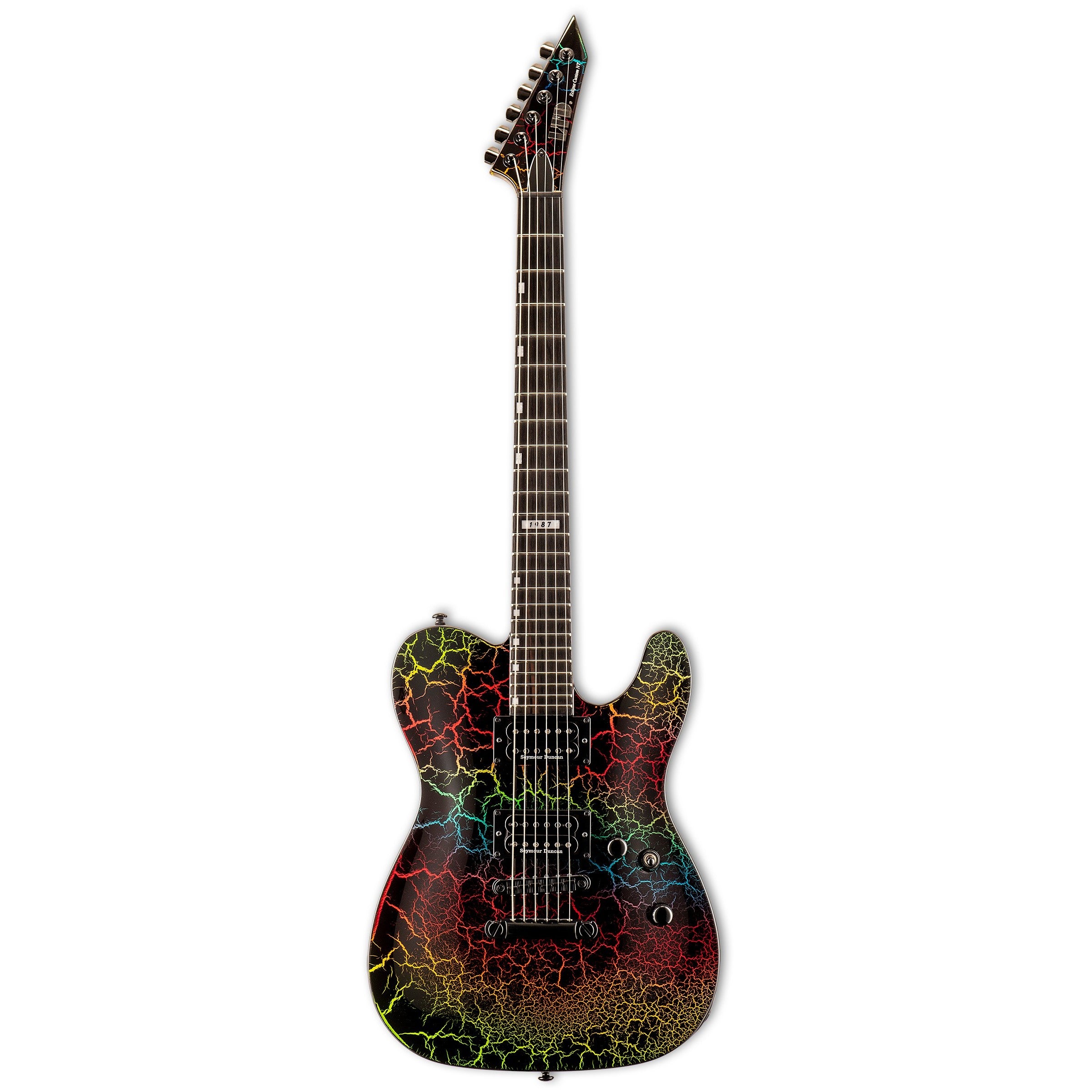 The LTD '87 Series celebrates the point in the mid-1980s when ESP’s guitars and basses grabbed the attention of players around the world. In addition to a variety of great '80s-focused solid color finishes, the '87 Series now also includes a full set in the classic (and coveted) ESP Rainbow Crackle finish. The Eclipse '87 is based on the original ESP Eclipse model, with a TE archtop shape. This guitar offers neck-thru-body construction with a mahogany body and three-piece maple neck at 24.75" scale. The Eclipse '87 includes a set of Seymour Duncan ’59 (neck) and JB (bridge) pickups, with original style bobbins and a push-pull volume control to split the coils. Other features include a Floyd Rose 1000 locking tremolo, Macassar ebony fingerboard, and 24 extra-jumbo frets.