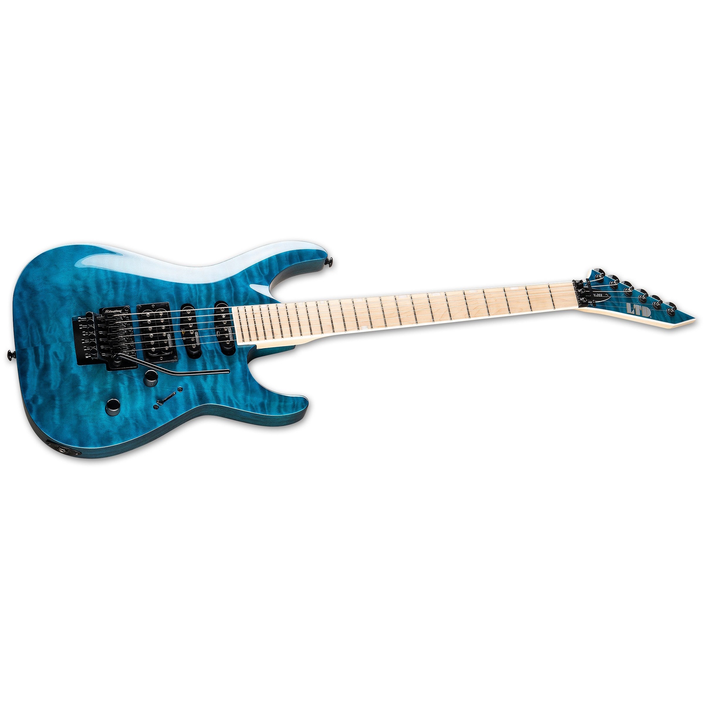 The MH-203QM offers the arched top of the ESP Horizon with the aggressive styling elements of the M Series, all wrapped in an affordable high-quality instrument, and adds a quilted maple top in See Thru Blue finish. It offers the versatile H/S/S (humbucker/single coil/single coil) pickup configuration, making it great for many genres of music. The MH-203QM features bolt-on construction of a mahogany body with a maple neck and maple fingerboard with 24 extra-jumbo frets, and includes an LTD by Floyd Rose tremolo.