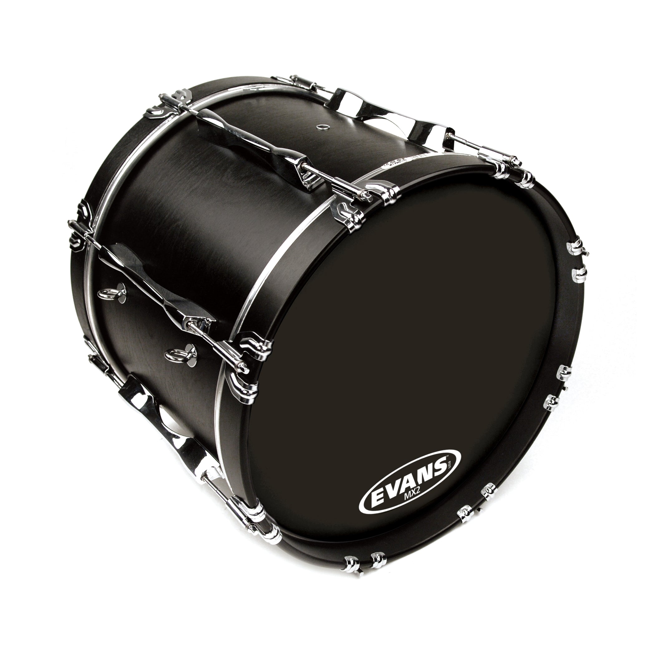 Evans MX2 black marching bass drum head produces a bright, focused tone with pronounced attack. This 2-ply series includes a unique tone damping system that can be manipulated by applying individual felt arcs (included) to enhance articulation and focus low-end for both indoor and outdoor marching. 28" drum head with two plies of 7.5mil film