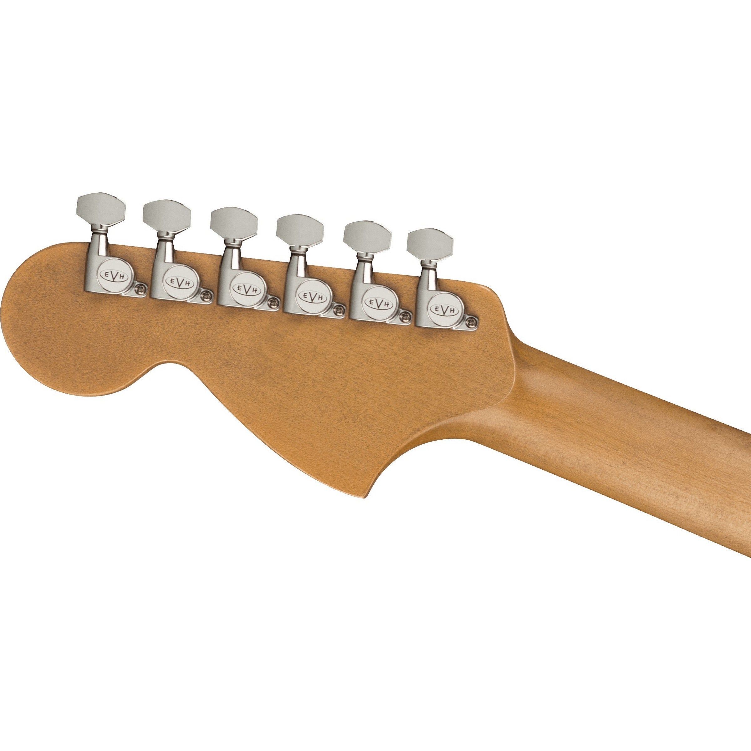 Other features include a skirted white Strat-style volume control knob (labeled "tone") with 500K EVH Bourns® low friction pot and treble bleed circuit, black pickguard, chrome hardware, oversized strap buttons, EVH neck plate and larger, '70s-style licensed Fender Strat headstock with gold EVH logo.