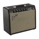 Premium features include: Hand-wired AA764 circuit with tube-driven spring reverb and tremolo, Fender Vintage Blue tone capacitors, Three 12AX7 and one 12AT7 preamp tubes, 5AR4/GZ34 rectifier tube, Matched pair of 6V6 power tubes, 12 watts output power, 10" Jensen® alnico P10-R speaker for sparkling clean tones and moderate breakup, Solid pine cabinet for resonance and lighter weight, Extra-heavy textured vinyl covering, Lightly aged silver grille cloth, Footswitch and amp cover included.