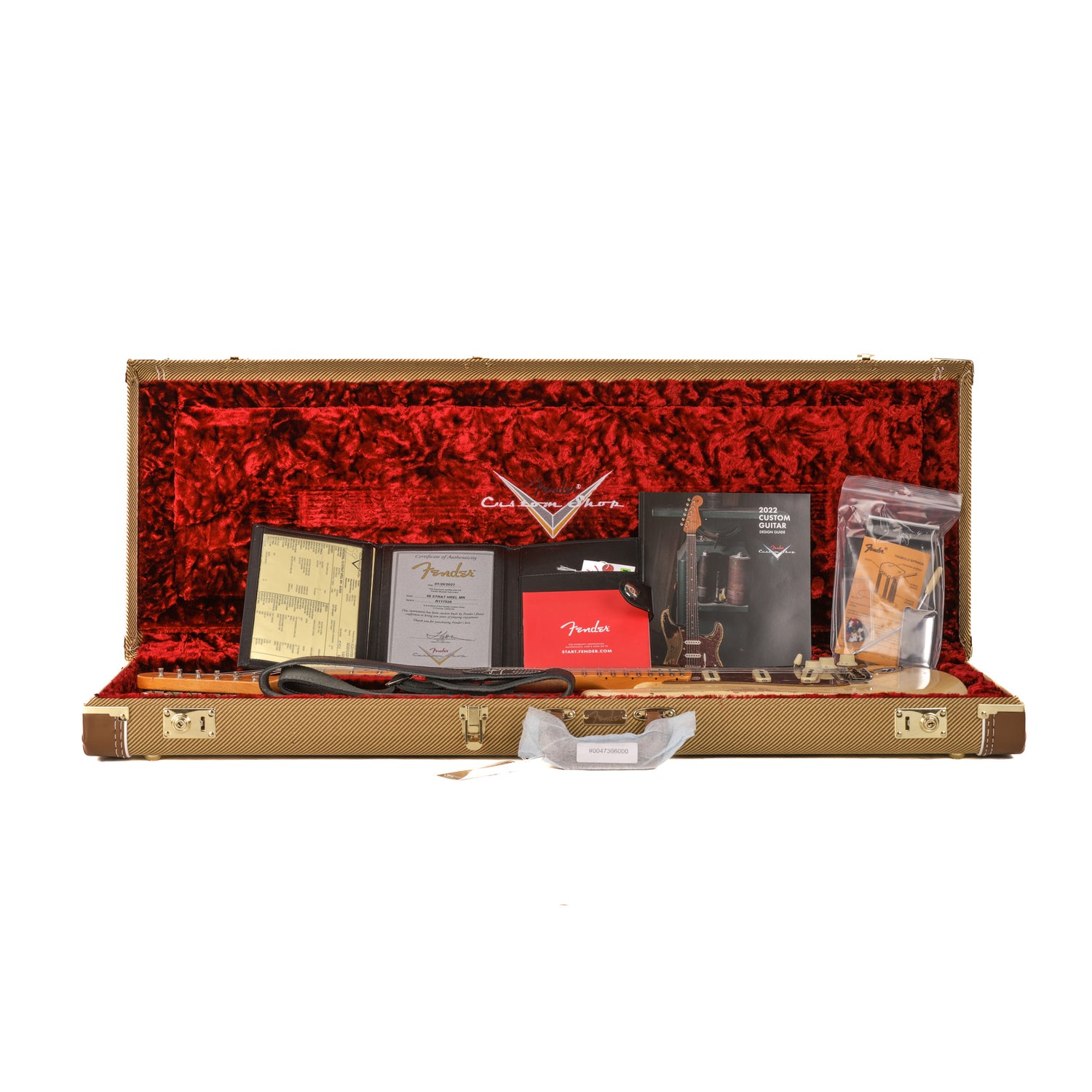 The two-piece select ash body exudes balanced highs and sweet midrange with lively resonance. The one-piece flat-sawn maple neck has a chunky ’54-style Soft “V” profile, topped by a comfortable vintage compound-radius (7.25”-9.5”) maple fingerboard that flattens slightly toward the nut for easy bending, with 21 medium vintage (47095) frets and a bone nut. All three Custom Shop hand-wound ’55 Strat® pickups (reverse-wound/reverse-polarity middle pickup for hum cancellation in switch positions 2 and 4) deliver crystal-clear highs and well-balanced midrange, with ’54-’58 vintage Strat wiring and five-way switching. Other premium features include a single-ply parchment pickguard, Custom Shop vintage synchronized tremolo bridge, vintage-style tuners, wing string tree with nylon spacer, deluxe hardshell case, strap and certificate of authenticity.