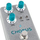 Glassy, shimmering, and bubbly– the Hammertone™ Chorus is a simple and powerful modulation device designed to deliver pristine choral sweeps. Pedal board-friendly top-mounted in & out jacks and true bypass footswitch mean it will integrate seamlessly into your rig.- Fender®-designed Chorus Effect