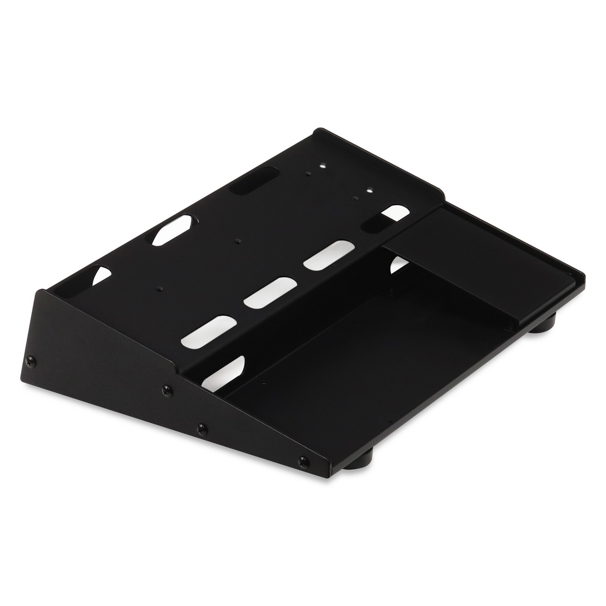 While most pedal boards have either a flat or a slanted surface, the TOUR PRO boards are designed with two tiers, a bottom section that is flat and a top section that is angled (with all the holes needed for easy cable routing). This two-tier design allows a guitar player to have access to all pedals on the board, without ballerina style, toe-extending dance moves. And, to address the need for Wah and/or Volume pedals, the TOUR PRO board includes detachable risers, which can be mounted in various locations on the bottom.