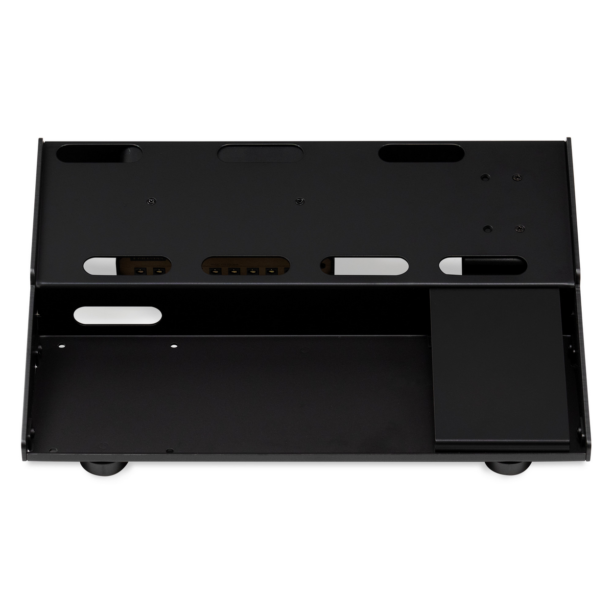 While most pedal boards have either a flat or a slanted surface, the Tour Pro Platinum boards are designed with two tiers, a bottom section that is flat and a top section that is angled(with all the holes needed for easy cable routing). This two-tier design allows a guitar player to have access to all pedals on the board, without ballerina style, toe-extending dance moves. And, to address the need for Wah and/or Volume pedals, the Tour Pro Platinum board includes a detachable riser, which can be mounted in various locations on the bottom tier(yes -we thought of left footed guitar players too).