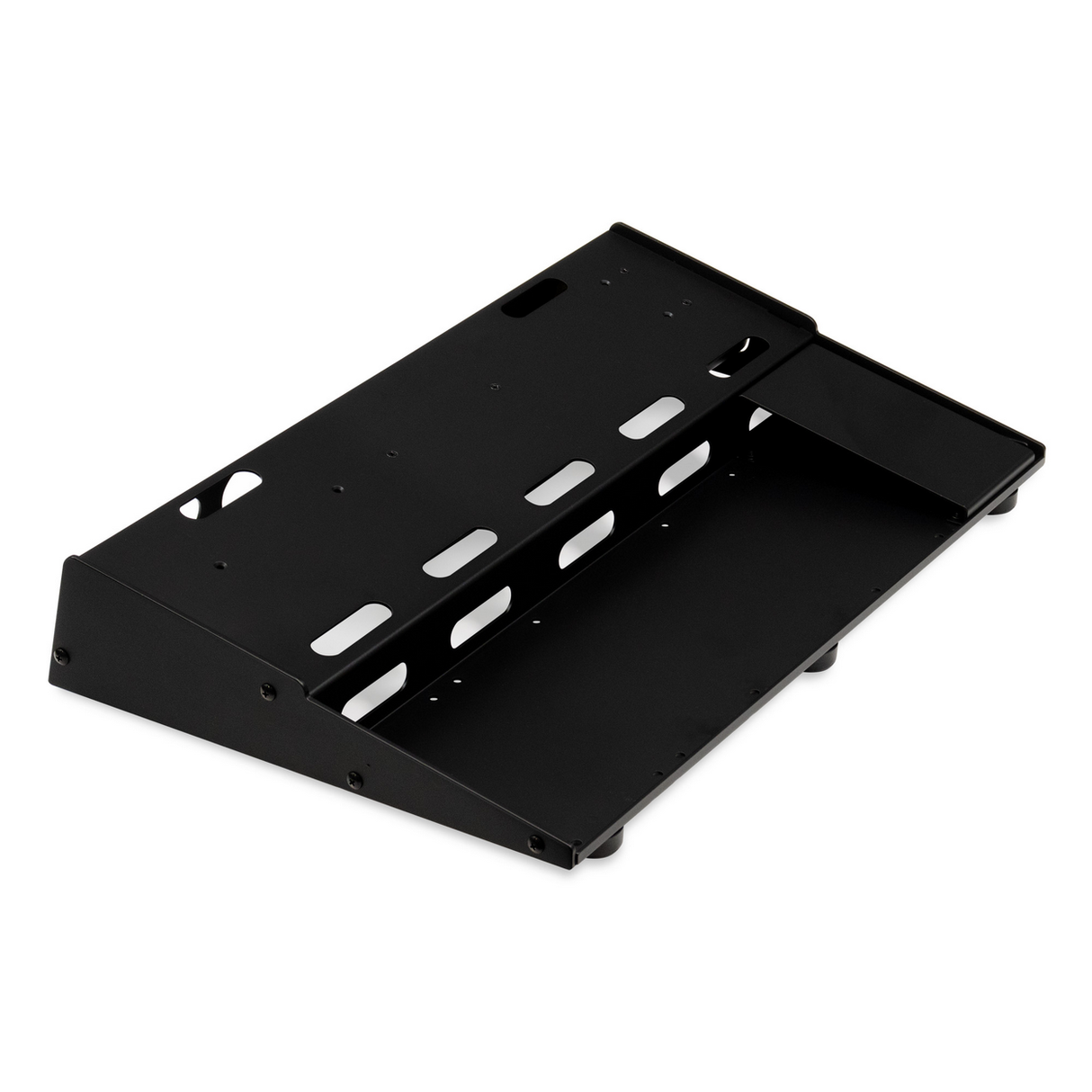 While most pedal boards have either a flat or a slanted surface, the Tour Pro Platinum boards are designed with two tiers, a bottom section that is flat and a top section that is angled(with all the holes needed for easy cable routing). This two-tier design allows a guitar player to have access to all pedals on the board, without ballerina style, toe-extending dance moves. And, to address the need for Wah and/or Volume pedals, the Tour Pro Platinum board includes a detachable riser, which can be mounted in various locations on the bottom tier(yes -we thought of left footed guitar players too).