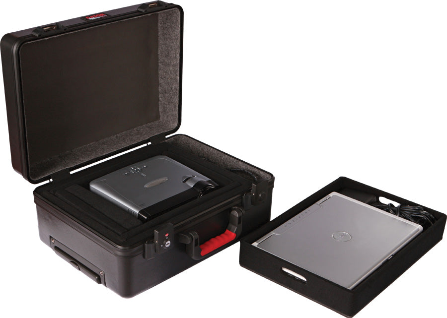 The Gator Cases GAV-LTOFFICETSA is an ATA molded case with wheels and tow handle and is removable tray for laptop and has TSA latches.