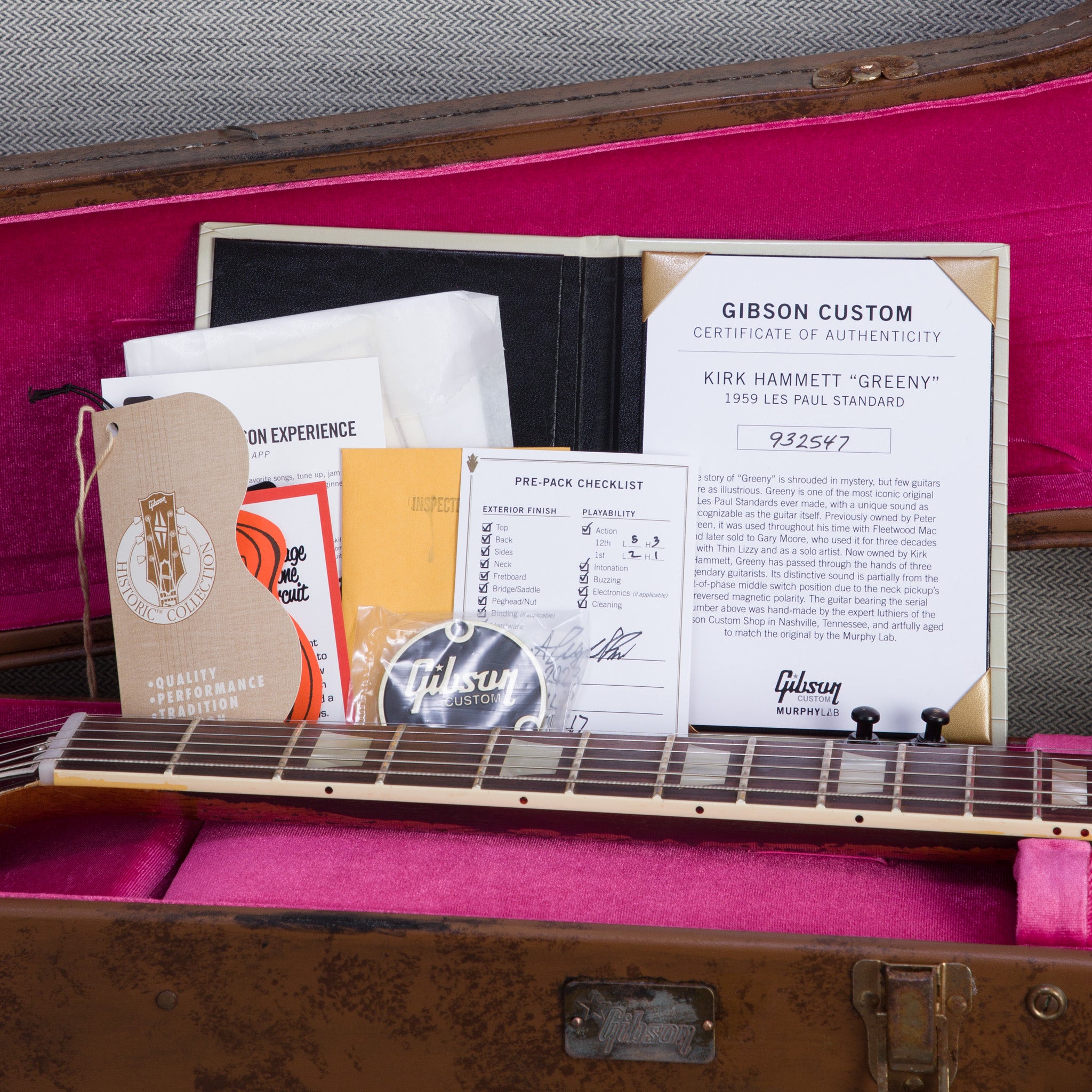 The story of “Greeny” is shrouded in mystery, but few guitars are as illustrious. Greeny is one of the most iconic original Les Paul Standards ever made, with a unique sound as recognizable as the guitar itself. Previously owned by Peter Green, it was used throughout his time with Fleetwood Mac and later sold to Gary Moore, who used it for three decades with Thin Lizzy and as a solo artist. Now owned by Kirk Hammett, Greeny has passed through the hands of three legendary guitarists. Its distinctive sound is partly from the out-of-phase middle switch position due to the neck pickup’s reversed magnetic polarity. The Kirk Hammett "Greeny" 1959 Les Paul Standard from the Gibson Custom Shop is artfully aged to match the original by the Murphy Lab and was inspired by this legendary guitar. With its Indian rosewood fretboard, it gives players around the world the opportunity to experience some of the magic of "Greeny" for themselves. A brown/pink Lifton™ reissue 5-latch case is also included.