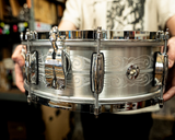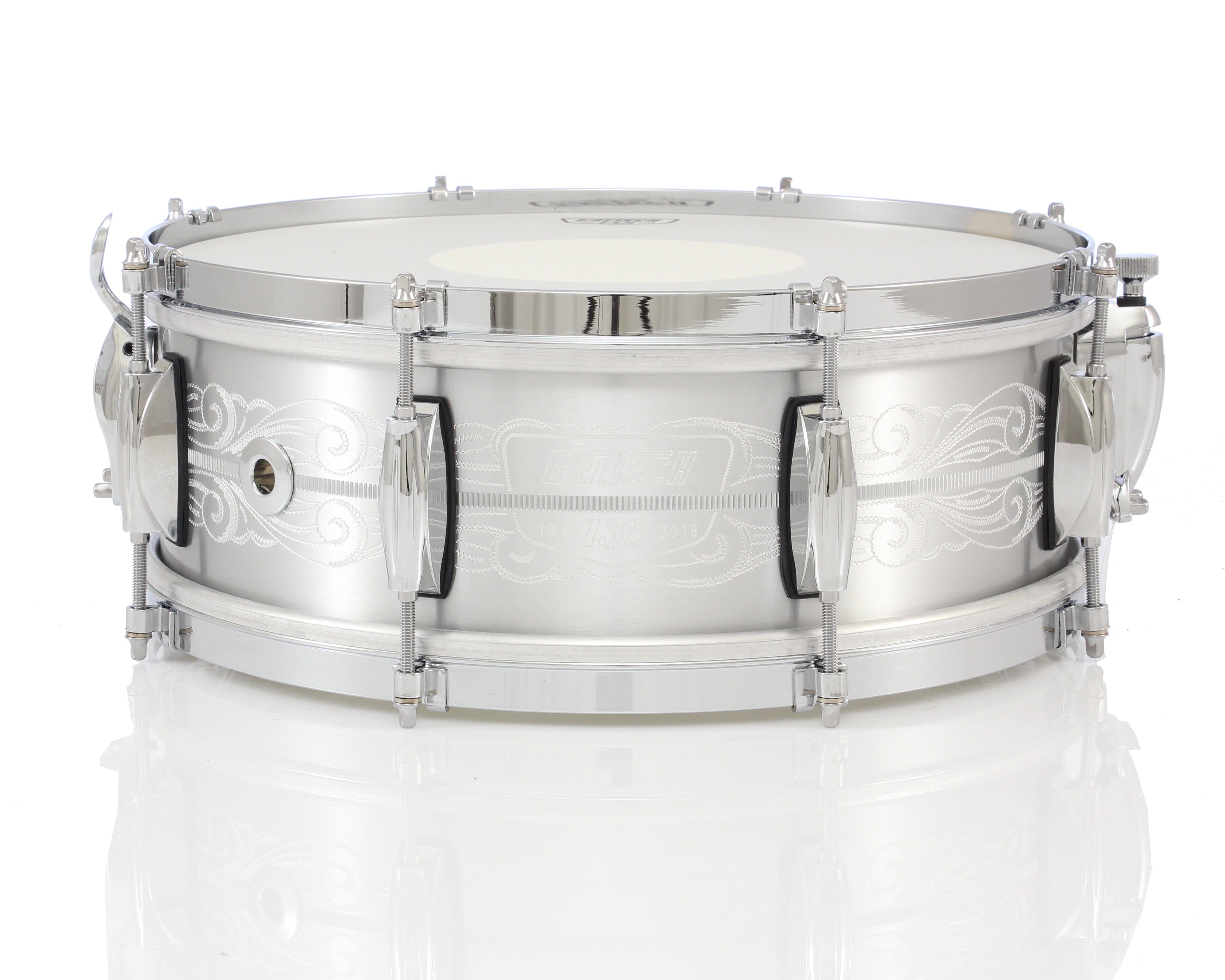 Offered to celebrate Gretsch's 135th Anniversary, these limited-run snares feature hand engraved designs by Eric Sooy, as well as classic single-flanged hoops for a much more open tone than the standard snare.