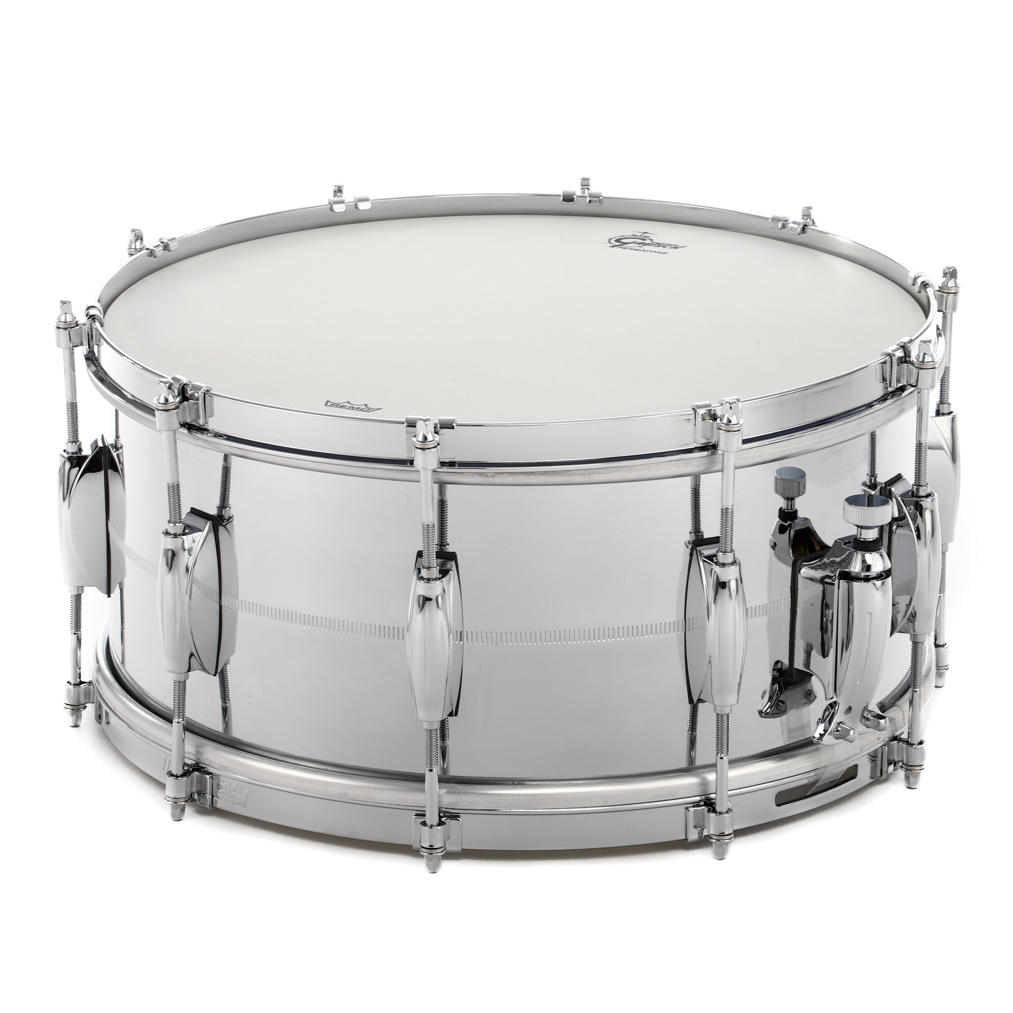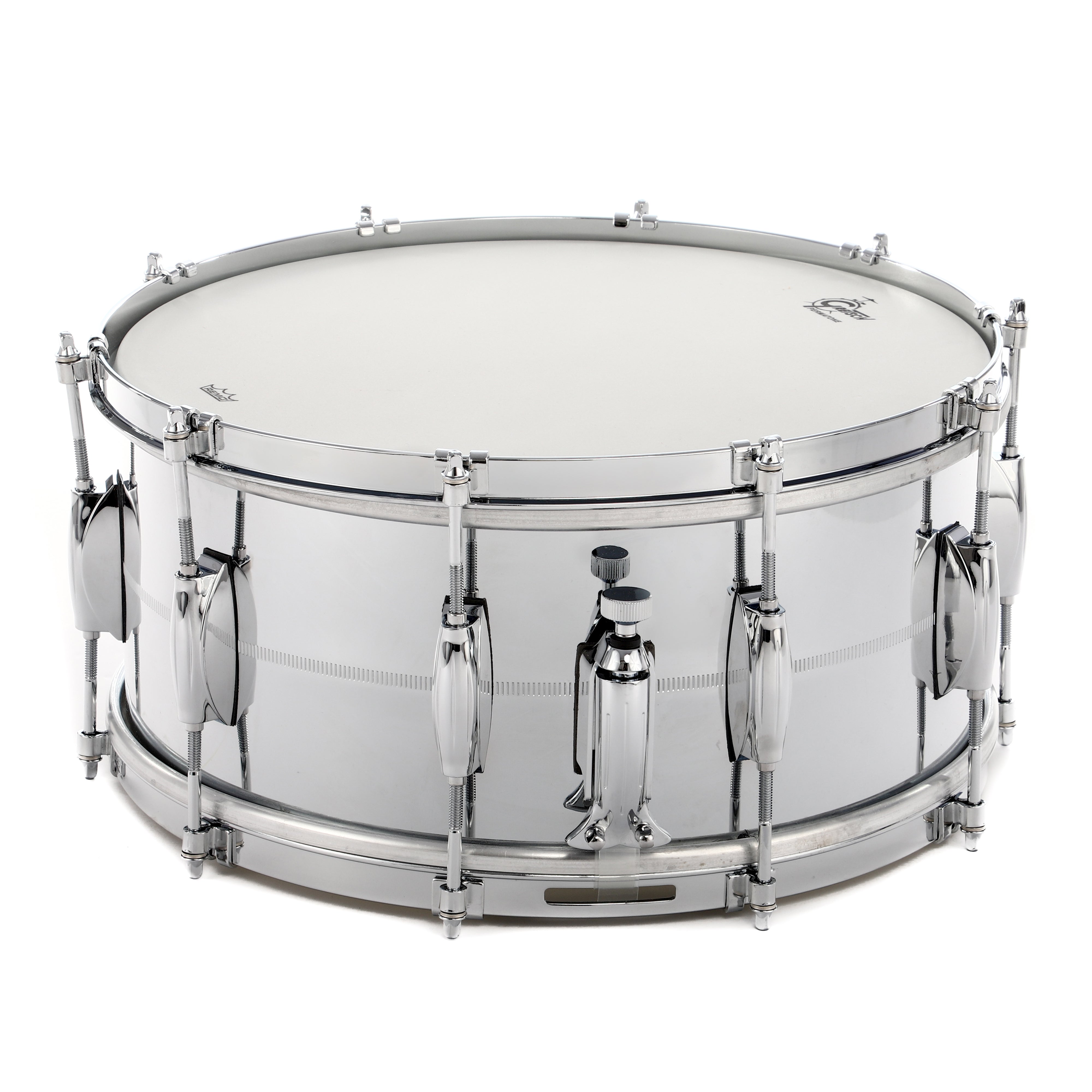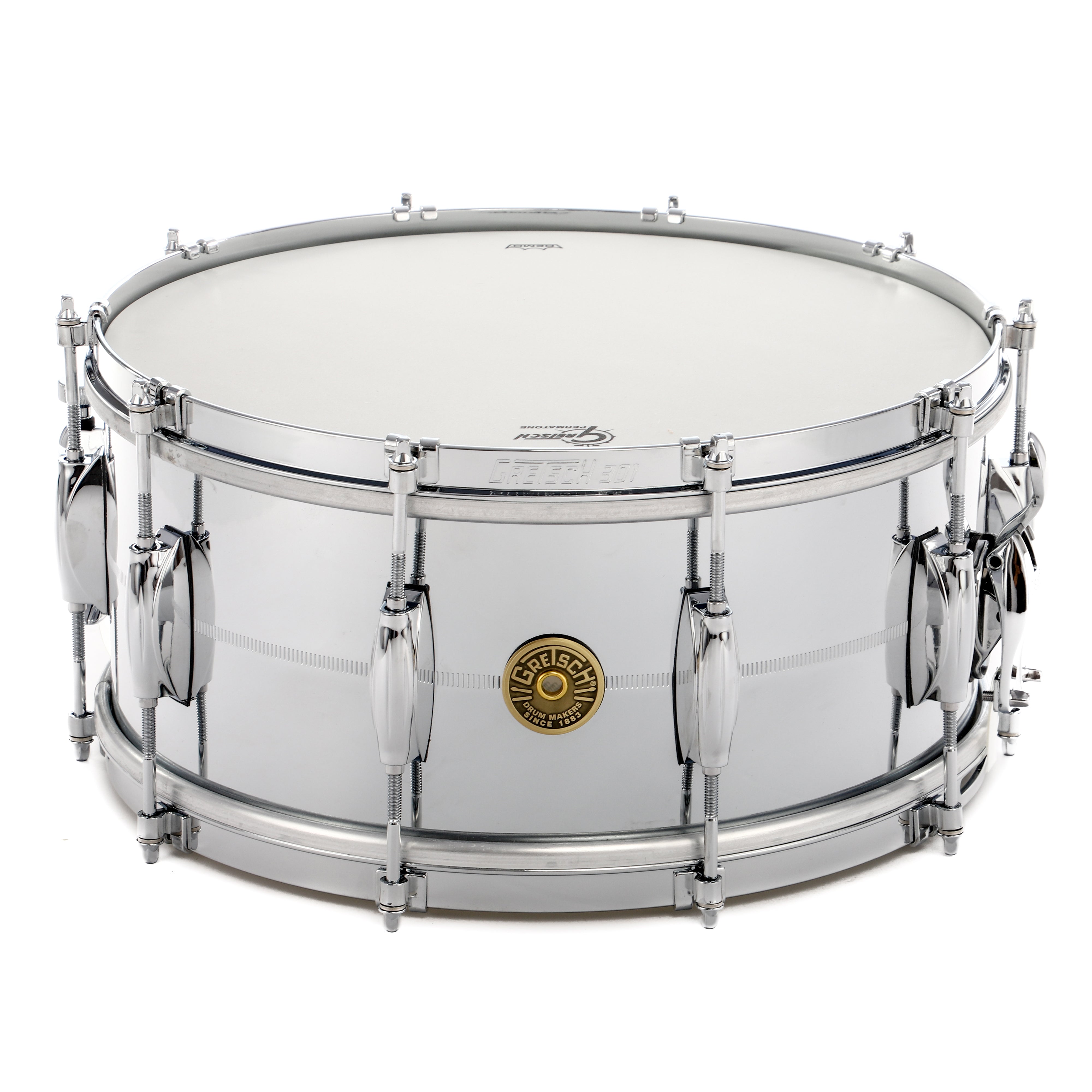 The Gretsch classic- crisp, powerful attack that always manages to find its own space in the overall mix. By chrome plating the brass shell, the high end of the drum is accentuated, making for a very controlled snap. Additional features include Lightning throw-off, die-cast hoops, 'Snap-In' key holder and 42-Strand snare wire.