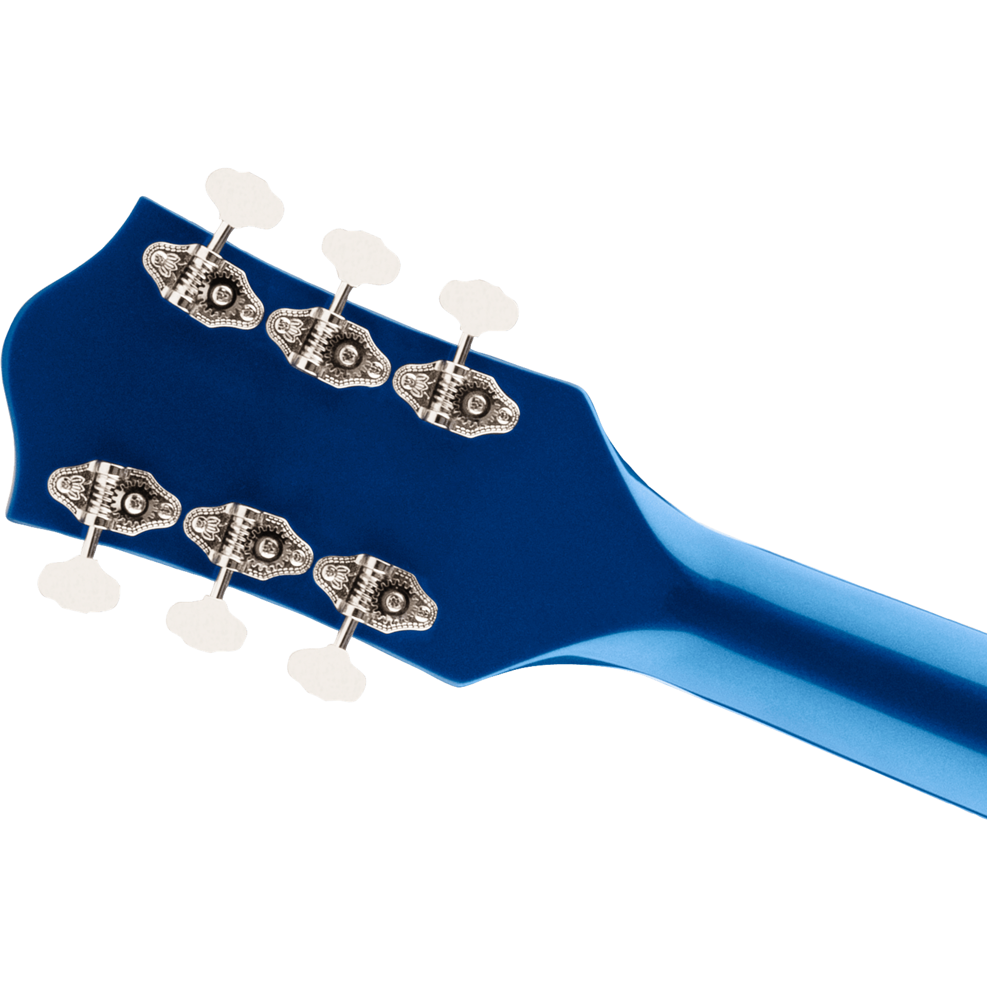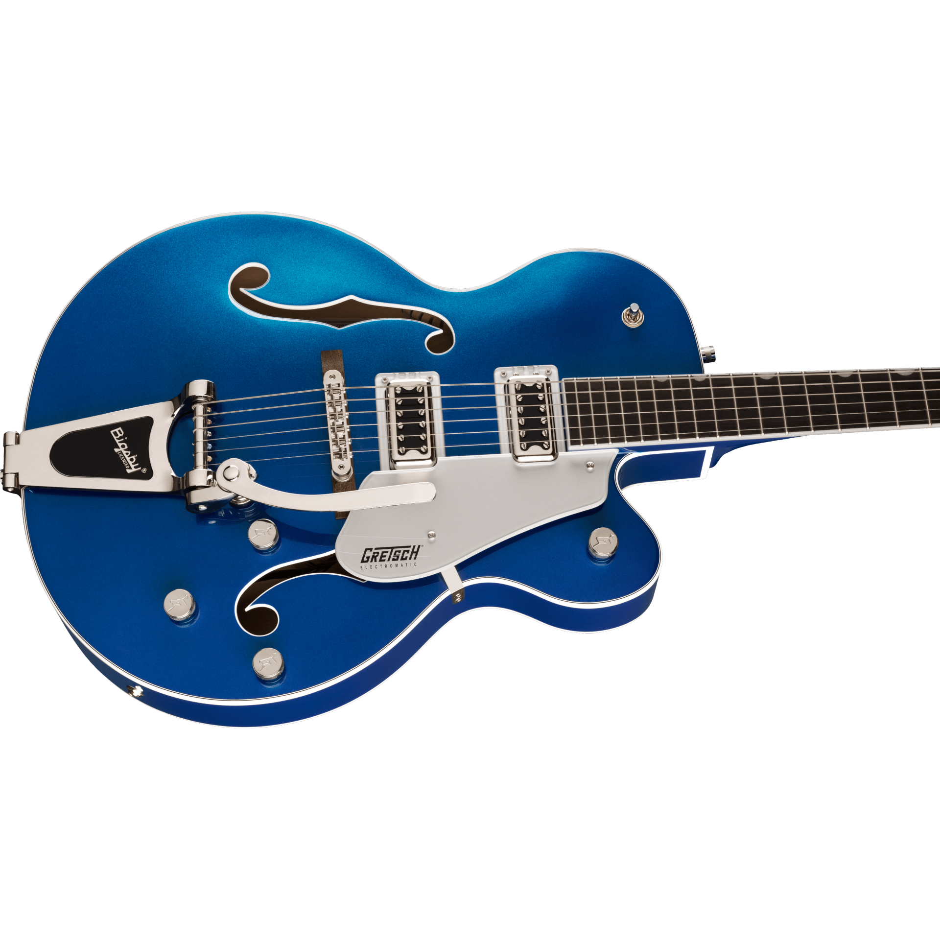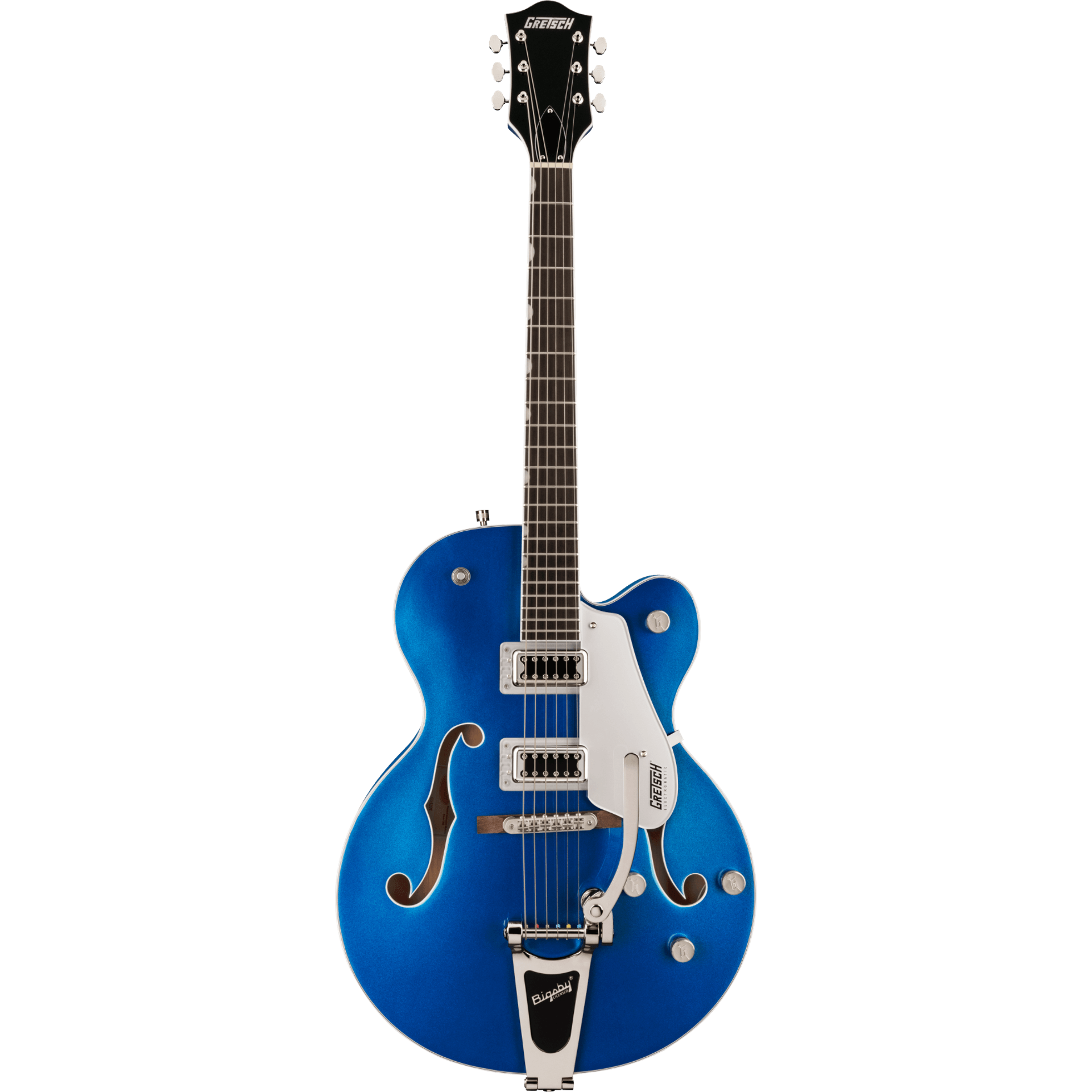 Alive and resonant, this G5420T also features a versatile upgraded control layout including master volume with treble bleed circuit, master tone, individual pickup volume controls and three-position pickup toggle switch, oversized bound F-holes, multi-ply body binding, smaller late-'50s G6120 bound headstock, vintage-style open-back standard tuning machines, Graph Tech® NuBone® nut, pearloid Neo-Classic™ Thumbnail inlays, secured Adjusto-Matic™ bridge and a Bigsby® B60 vibrato tailpiece. This resplendent instrument comes in a standout Azure Metallic finish, complete with silver pickguard and nickel hardware.