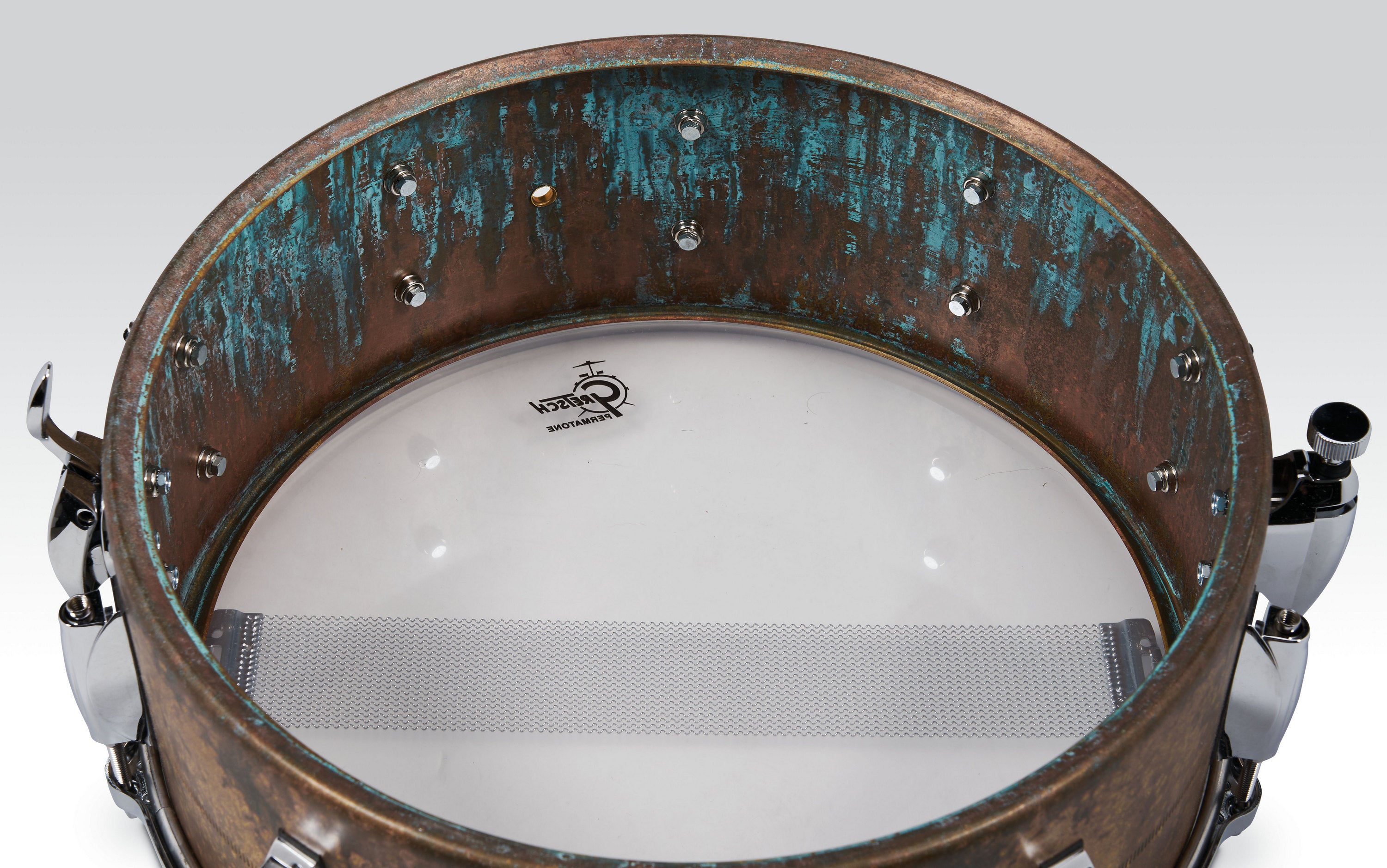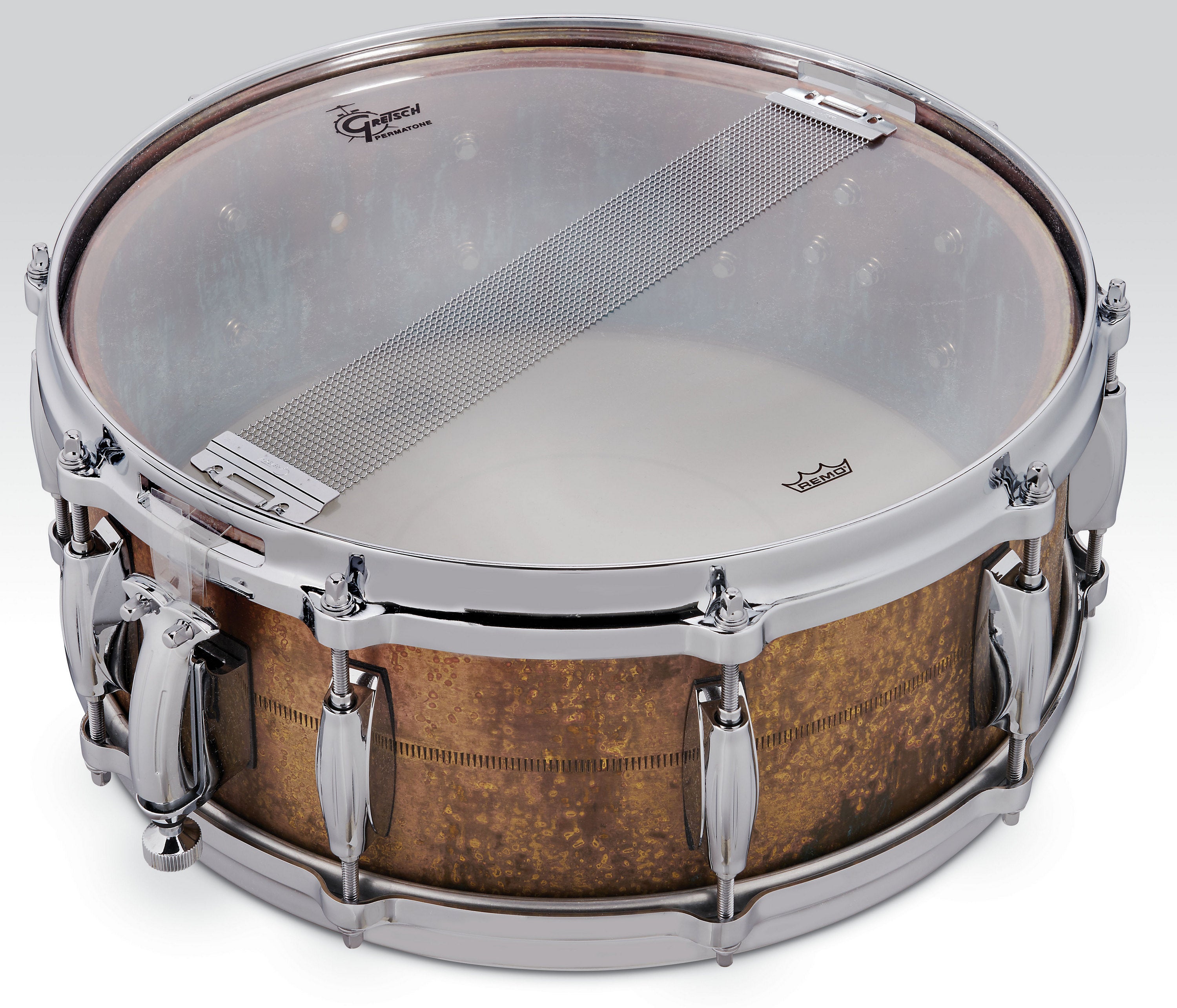 The drum's foundation is a 5.5x14" 2mm Vintage Patina brass shell. Capturing the "antique" look throughout the shell, a unique aging compound was developed at the Gretsch factory in Ridgeland, South Carolina. To increase the dynamics and pitch range, Keith preferred the 20-strand snare wire vs. the 42-strand. And he opted for a standard Permatone drumhead rather than our Permatone Control Sound.