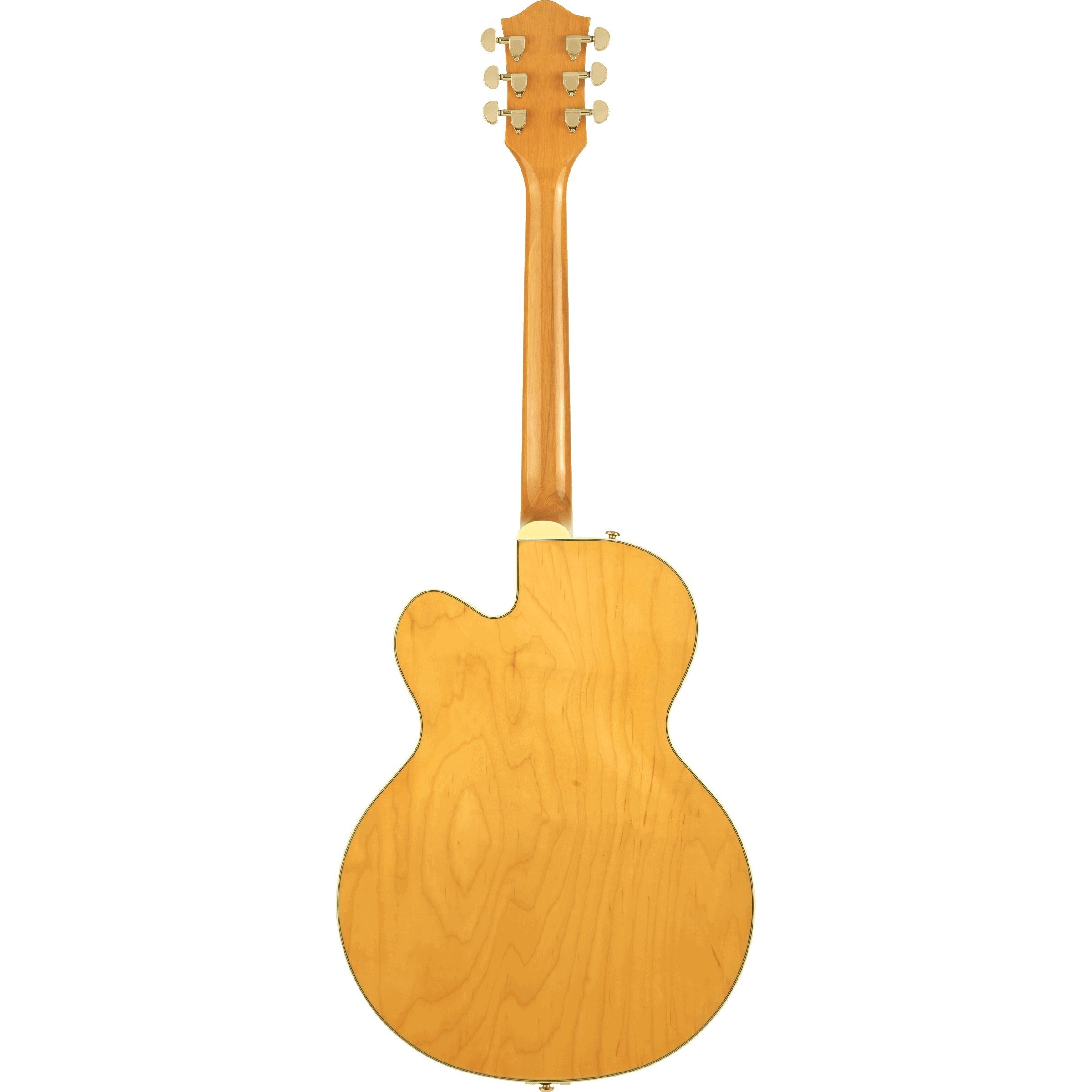 A fast-playing 12”-radius laurel fingerboard with elegant pearloid Hump Block inlays and 22 medium jumbo frets sits atop the white-bound nato neck with a thin “U”-shaped profile—ideal for chord work or firing off hot-rodded riffing. Add some shimmer and expression to your playing with the Bigsby-licensed B60 vibrato tailpiece, while the Adjusto-Matic™ bridge with secured laurel base and synthetic bone nut grant amazing tuning stability. All the classic eye-catching style you’ve come to expect from Gretsch is here—vintage-style black control knobs, enlarged F-holes for increased acoustic projection, elegant aged white binding with upgraded purfling and gleaming gold hardware.