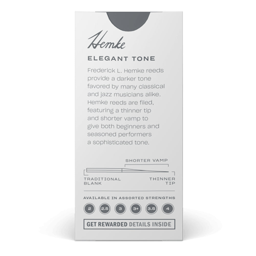 A wide variety of musicians prefer Frederick L. Hemke reeds because their filed, thinner tip and shorter vamp provide both beginners and seasoned performers with a warm, sophisticated tone.