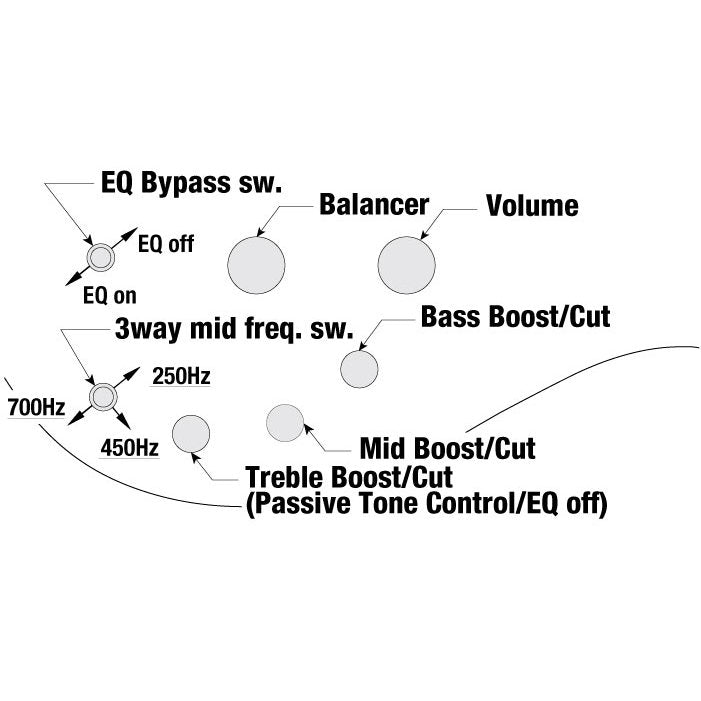- Equaliser: Ibanez Custom Electronics 3-band EQ w/ EQ bypass switch (passive tone control on treble pot), 3-way Mid frequency switch