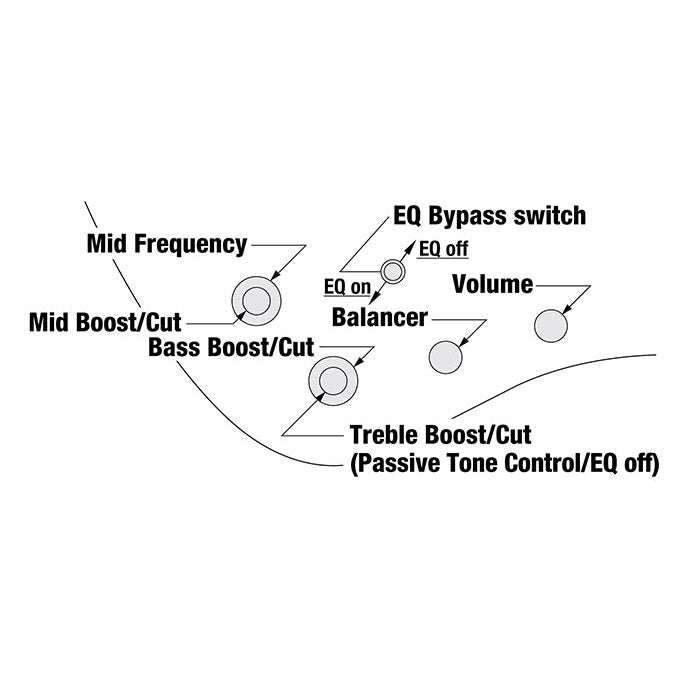 - Equaliser: Vari-mid 3-band EQ W/ EQ Bypass Switch (Passive Tone Control on Treble Pot)