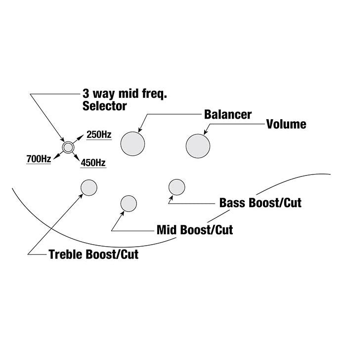 - Equaliser: Ibanez Custom Electronics 3-band Eq W/ 3-way Mid Frequency Switch
