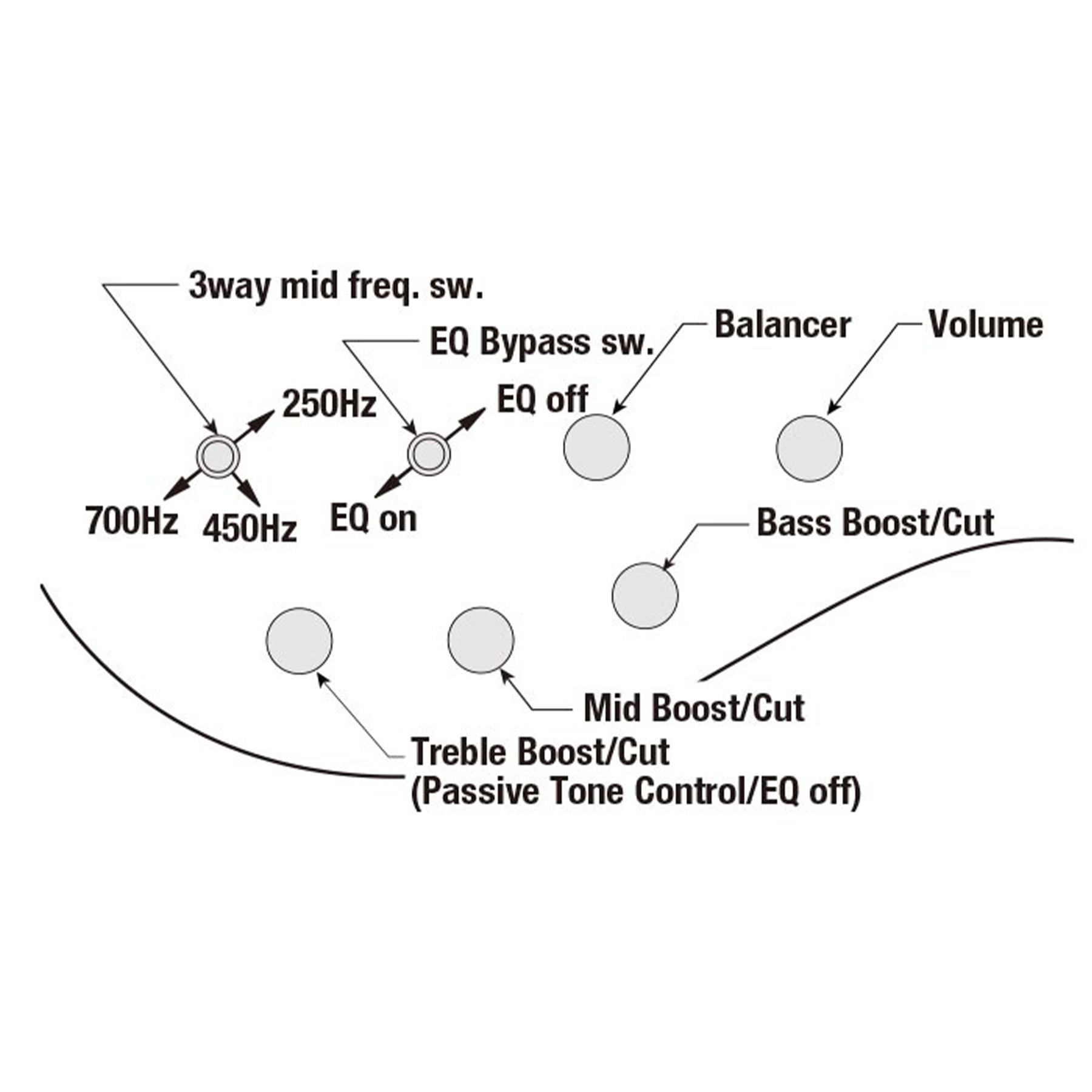 - Additional Controls: EQ bypass switch (passive tone control on treble pot), 3-way Mid frequency switch
