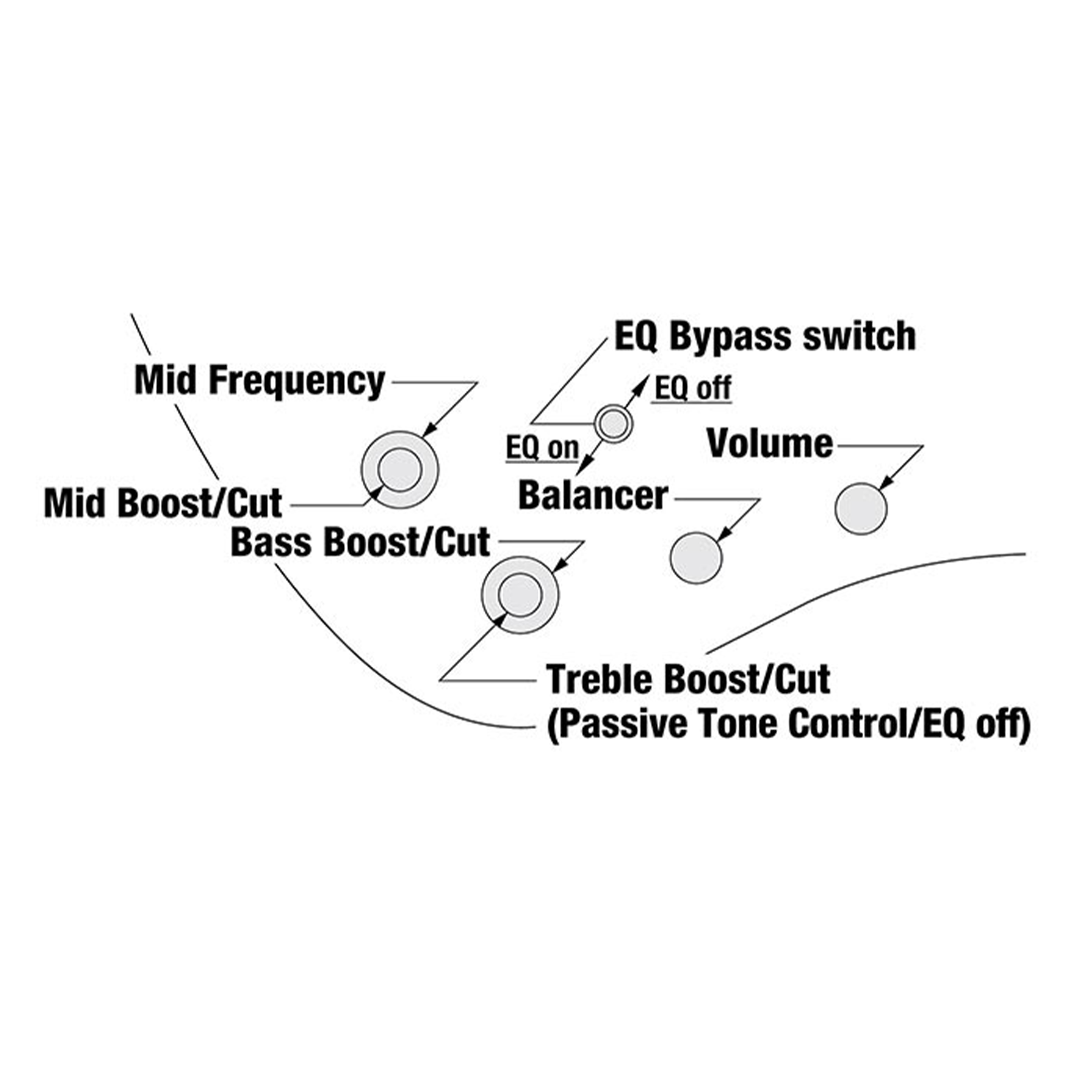 - Equaliser: Vari-Mid 3-Band EQ w/EQ Bypass Switch (Passive Tone Control on Treble Pot)