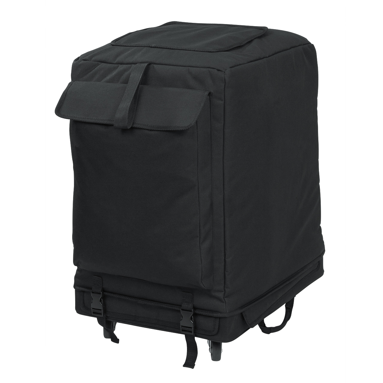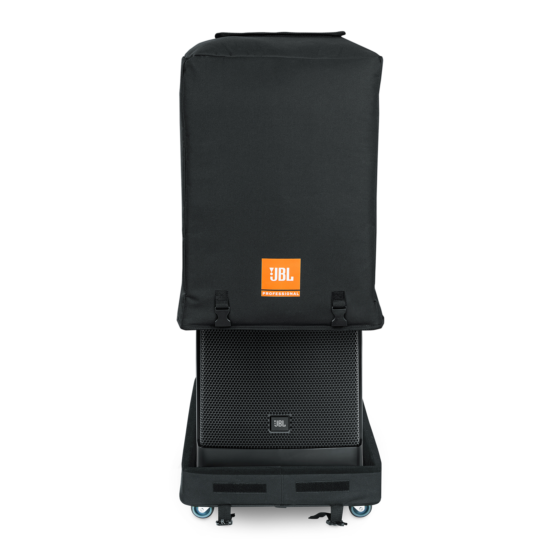 Padded cover w/ lightweight rolling base for EON ONE system, includes large back pocket and swivel casters with integrate pull behind strap and lifting handles, cover top handle cutout, printed JBL logo