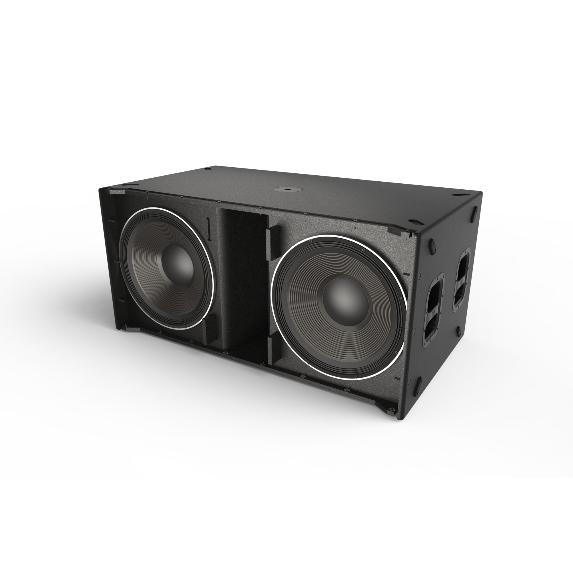 The SRX928S is a dual 18-inch active subwoofer designed to complement SRX900 full-range sound reinforcement systems. The sub¬woofer houses two JBL 2279-1 18-inch woofers, featuring Differential Drive – JBL’s dual voice coil, dual gap technology – to deliver better heat dissipation, lower power compression, and wider dynamic range than conventional single-coil designs.