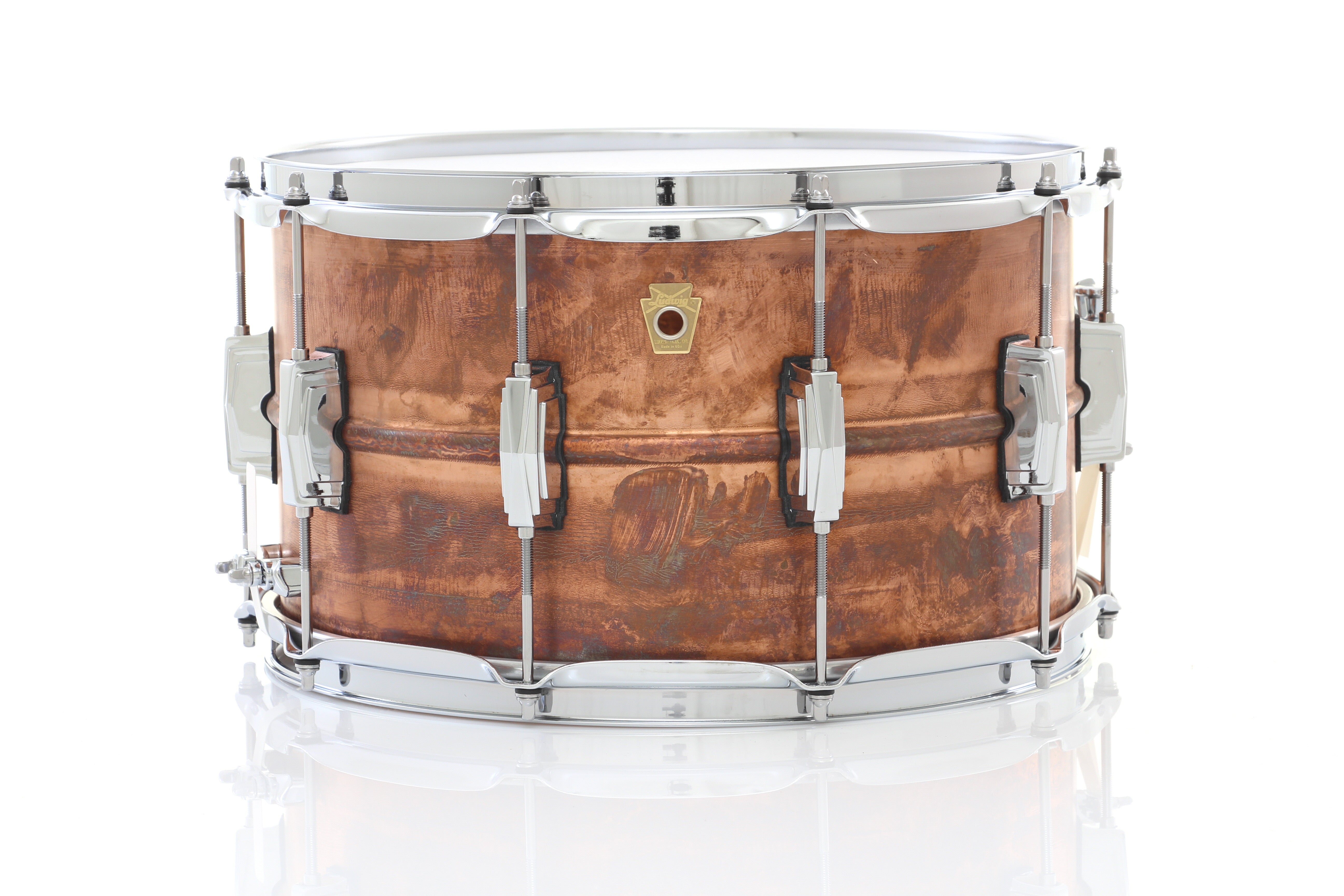 With close to 100 years of experience building copper timpani, the newest member of the Ludwig snare drum range is the Ludwig Copper Phonic snare drum. This Ludwig Copper Phonic snare drum features a dark raw copper finish, 1.2mm thick shell, Imperial lugs, and 2.3mm hoops. Ludwig Copper Phonic snare drums are built to the same professional standards as our Black Beauty, Supraphonic, and Bronze Phonic models, the new Ludwig Copper Phonic Drum is a proud addition to the Ludwig USA family and a legend in the making.